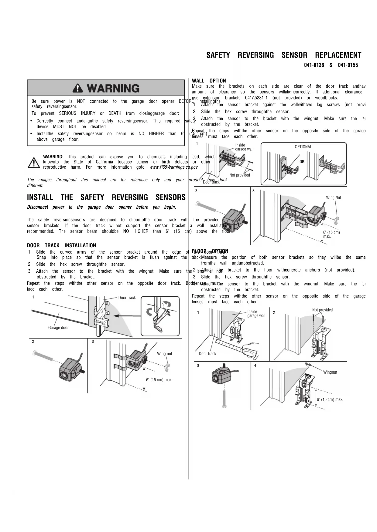 If the test continues to fail, calla trained door systems technician. Receiving sensor Green LEDREMPLACEMENT DU CAPTEUR D’INVERSION DE SÉCURITÉ 041-0136 ET 041-0155 S’assurer que l’ouvre-porte de garage est hors tensionAVANT d’installer le capteur d’inversion de sécurité. Pour prévenir des BLESSURES GRAVES ou MORTELLES par suite d’une porte de garage qui se ferme:
