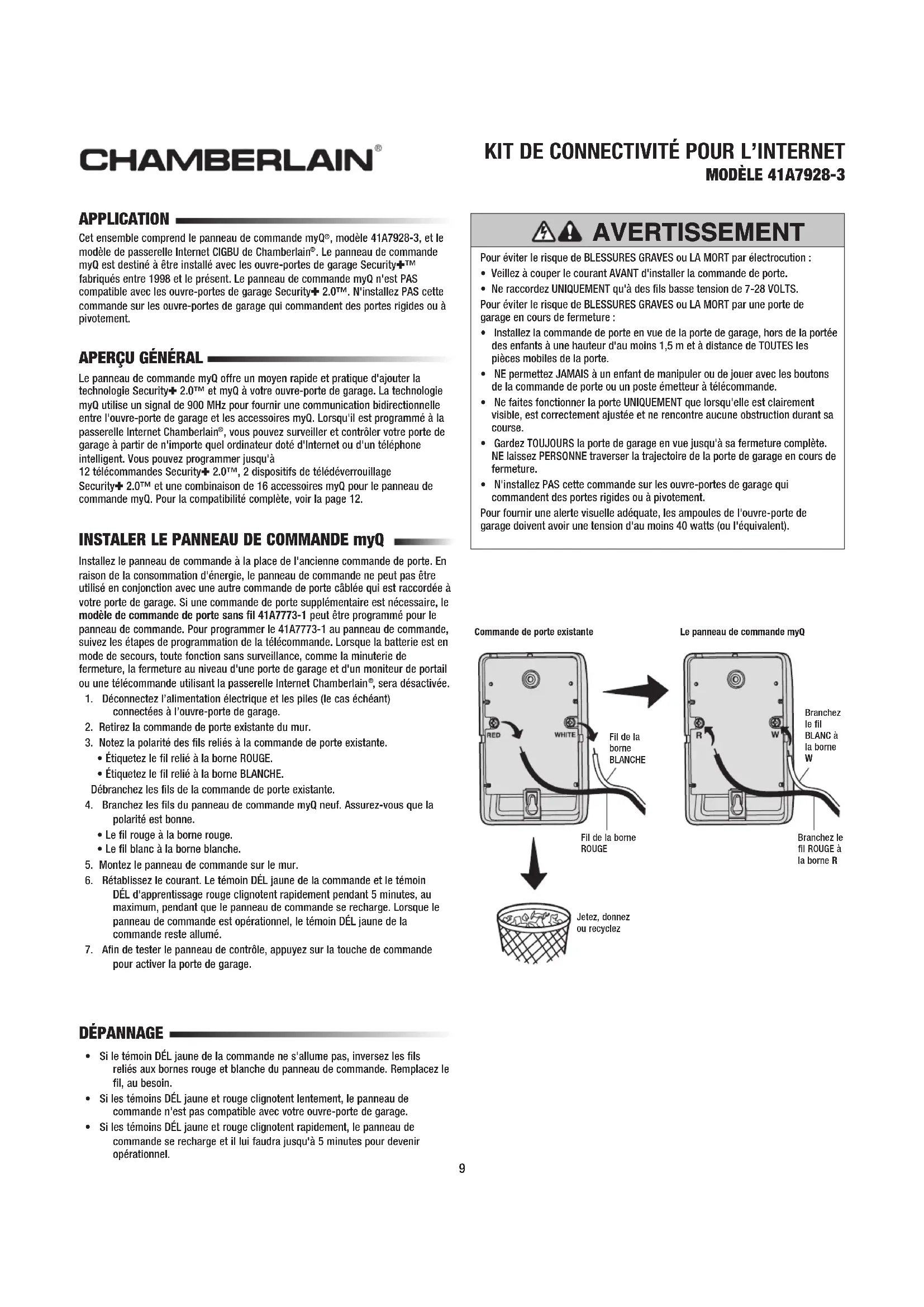 pour activer la porte de garage. INSTALER LE PANNEAU DE COMMANDE myQ Commande de porte existanteJetez, donnez ou recyclezFil de la borne ROUGEBranchez le fil ROUGE à la borne RFil de la borne BLANCHEBranchez le fil BLANC à la borne Le panneau de commande myQ