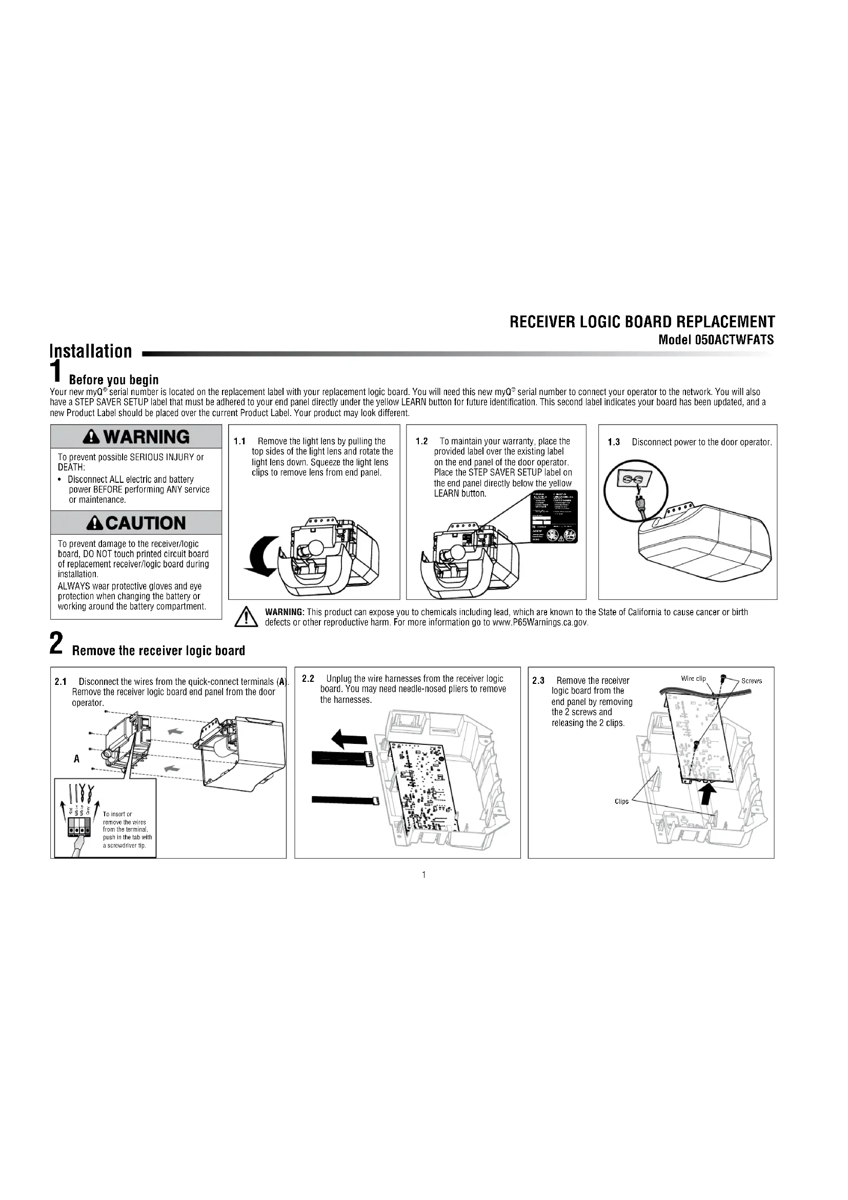 - Débranchez TOUTE l’alimentation électrique et la batterie AVANT d’effectuer TOUT service ou entretien. Pour éviter d’endommager le récepteur/ la carte logique, ne touchez PAS le circuit imprimé du récepteur/de la carte logique de remplacement pendant l’installation. Portez TOUJOURS des gants et des lunettes de protection lorsque vous changez la batterie ou que vous travaillez autour du compartiment de la batterie.