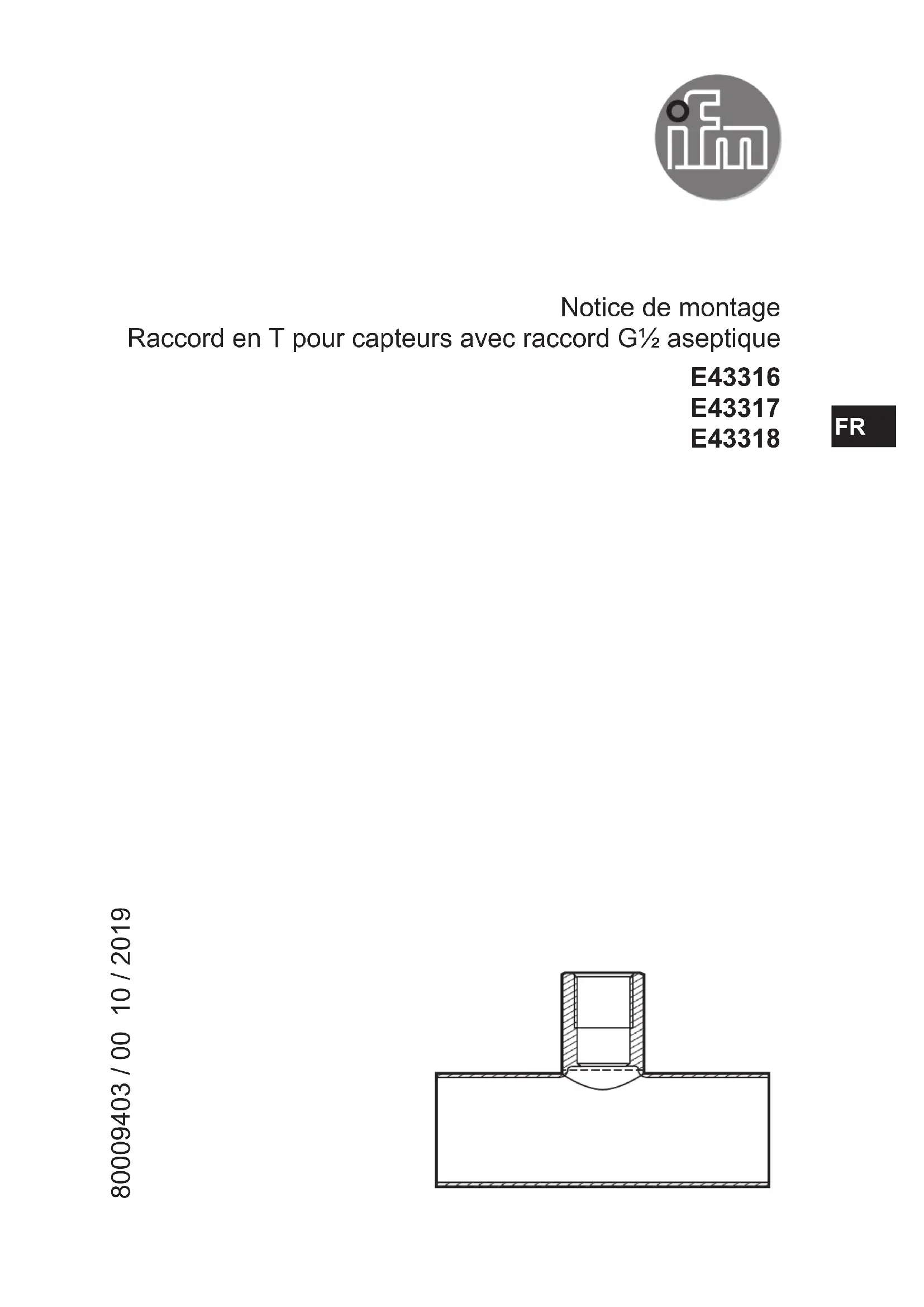 Notice de montage Raccord en T pour capteurs avec raccord G½ aseptique E43316 E43317 E43318 80009403 / 00 10 / 2019 FR2 1 Remarques préliminaires