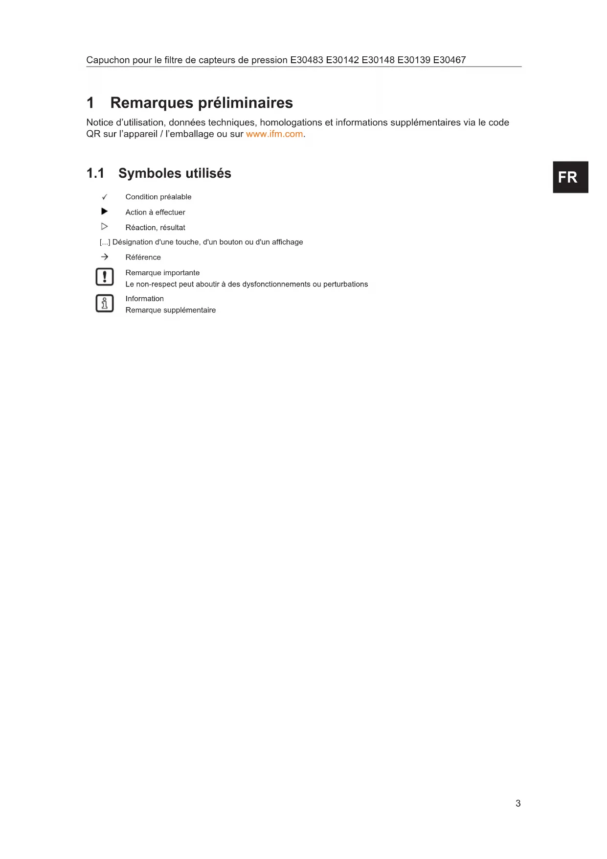 1 Remarques préliminaires Notice d’utilisation, données techniques, homologations et informations supplémentaires via le code QR sur l’appareil / l’emballage ou sur www.ifm.com. 1.1 Symboles utilisés Condition préalable Action à effectuer Réaction, résultat [...] Désignation d'une touche, d'un bouton ou d'un affichage Référence Remarque importante Le non-respect peut aboutir à des dysfonctionnements ou perturbations Information Remarque supplémentaire FRE30483 E30142 E30148 E30139 E30467 Capuchon pour le filtre de capteurs de pression