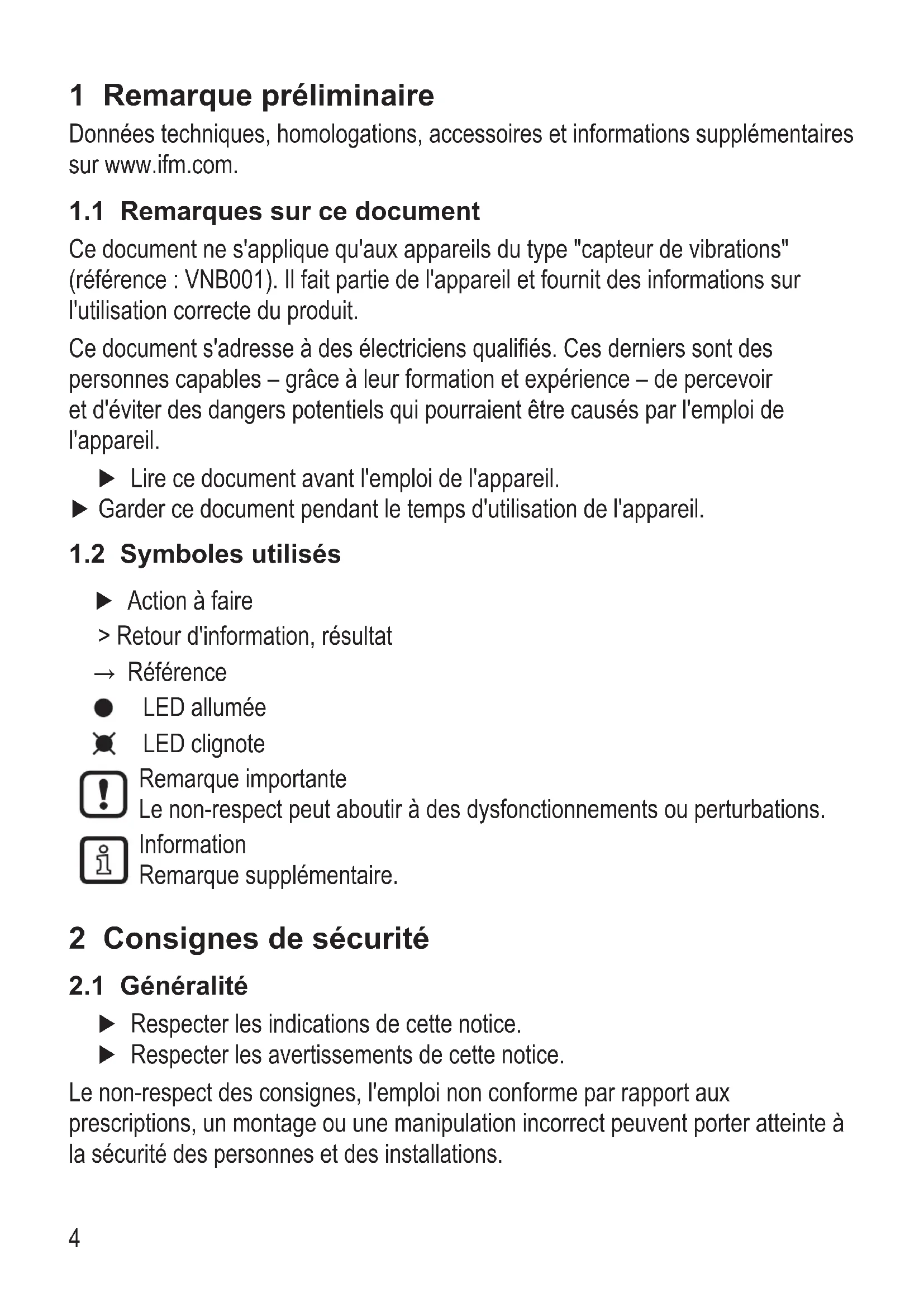 Ce document ne s'applique qu'aux appareils du type "capteur de vibrations" (référence : VNB001) Il fait partie de l'appareil et fournit des informations sur l'utilisation correcte du produit Ce document s'adresse à des électriciens qualifiés Ces derniers sont des personnes capables – grâce à leur formation et expérience – de percevoir et d'éviter des dangers potentiels qui pourraient être causés par l'emploi de l'appareil ► Lire ce document avant l'emploi de l'appareil ► Garder ce document pendant le temps d'utilisation de l'appareil