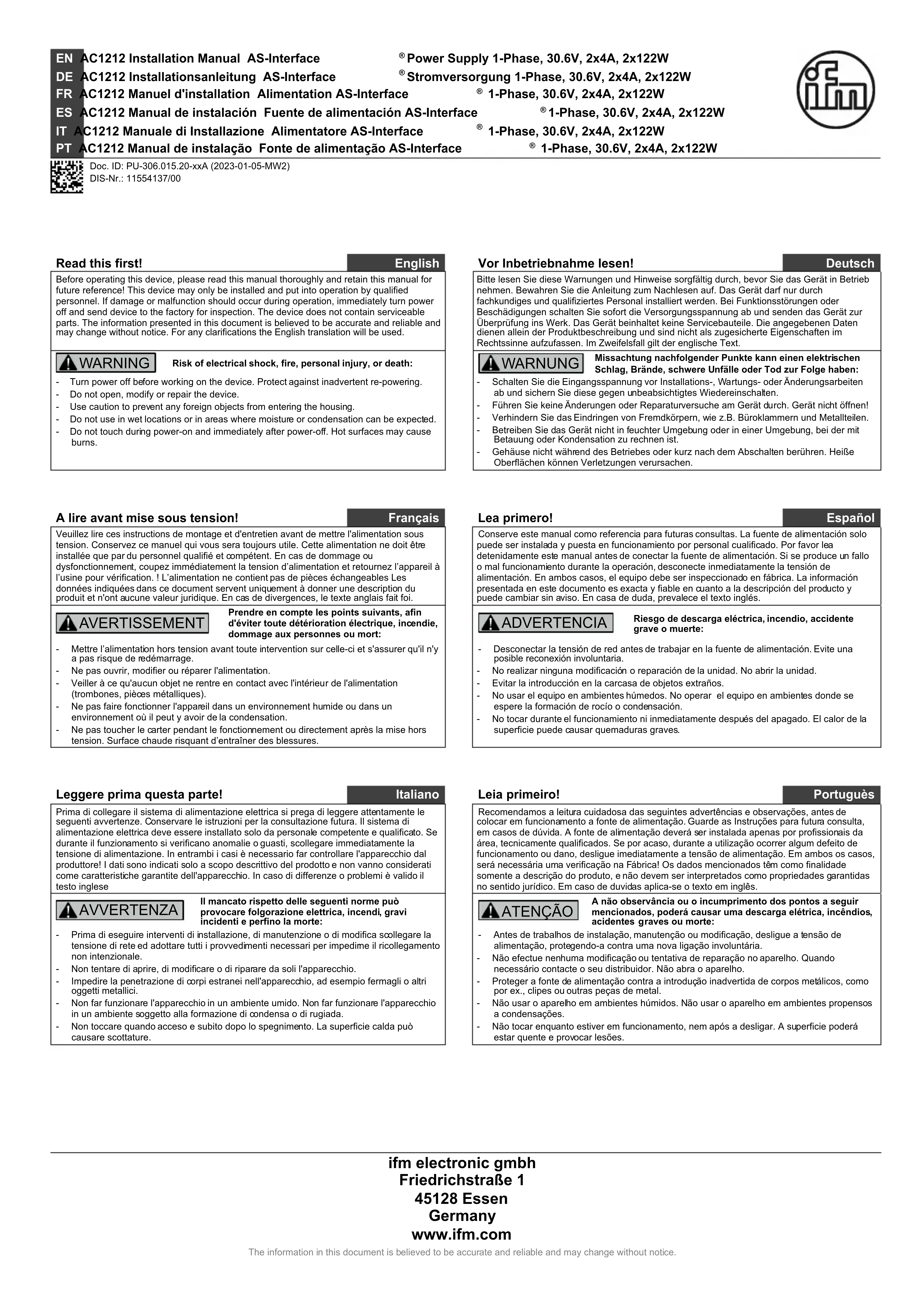 AC1212 - Alimentation électrique IFM - Notice d'utilisation et mode d'emploi gratuit