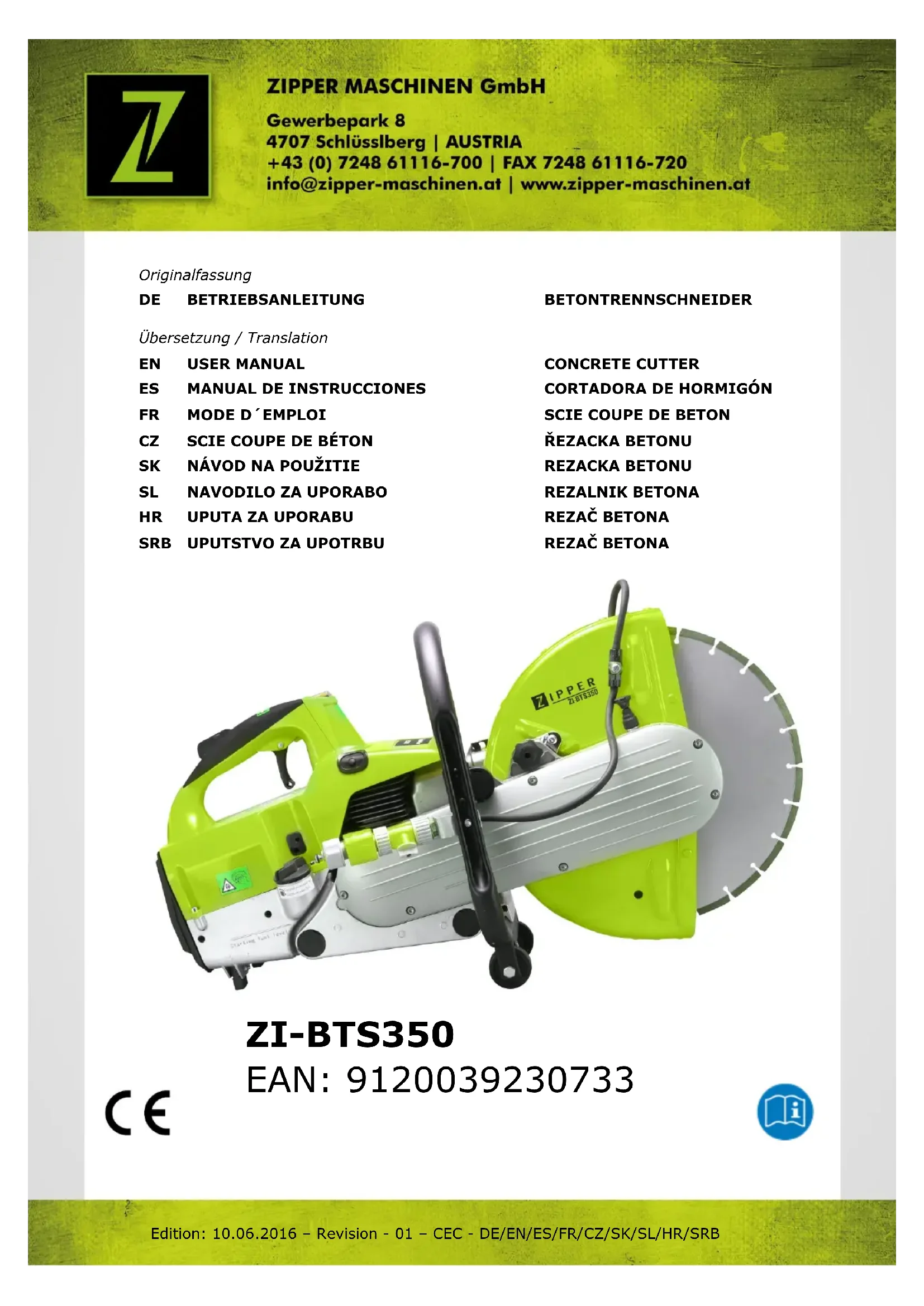 El motor se detiene poco después de arrancar de nuevo La velocidad de ralentí demasiado bajo Filtro de combustible bloqueado Depósito de combustible está vacío Ajuste la velocidad de ralentí Cambio del filtro de combustible Repostar Potencia del motor baja Filtro de aire obstruido Limpie o cambie el filtro de aire Disco de sierra no gira Correa en V defectuosa Acoplamiento defectuoso Cambiar la correa Reparación de la máquina El disco de sierra oscila El eje del disco de sierra Compruebe los rodamientos de bolas, eje, la brida y tuerca. Reemplace si están defectuosos.PREFACE (FR) ZIPPER MASCHINEN GmbH www.Zipper-Maschinen.at 49 ZI-BTS350 24 PREFACE (FR) Cher Client, Ce manuel contient des informations et des conseils pour une utilisation correcte et sûre ainsi que pour l'entretien de la scie coupe béton ZI-BTS350. Le manuel fait partie de la machine et ne peut pas être stocké séparément. Lire attentivement avant la première utilisation de la machine et le conserver pour référence future. Lorsque la machine est à d'autres personnes, toujours mettre le manuel avec la machine! S'il vous plaît suivez les consignes de sécurité! S'il vous plaît lire le manuel en entier, pour éviter les malentendus, dommages à la machine ou même des blessures. En raison du développement continu de nos produits, illustrations, photos peuvent différer légèrement. Toutefois, si vous trouvez des erreurs dans ce manuel, s'il vous plaît nous en informer. Sous réserve de modifications techniques! S'il vous plaît vérifier le contenu du produit immédiatement après réception pour quelque éventuelle dommages de transport ou de pièces manquantes. Les réclamations pour dommages de transport ou de pièces manquantes doivent être faites immédiatement après la réception initiale (en 24 heures) et le déballage de la machine, avant de mettre la machine en fonctionnement. S'il vous plaît noter que les demandes ne peuvent être acceptées plus tard.
