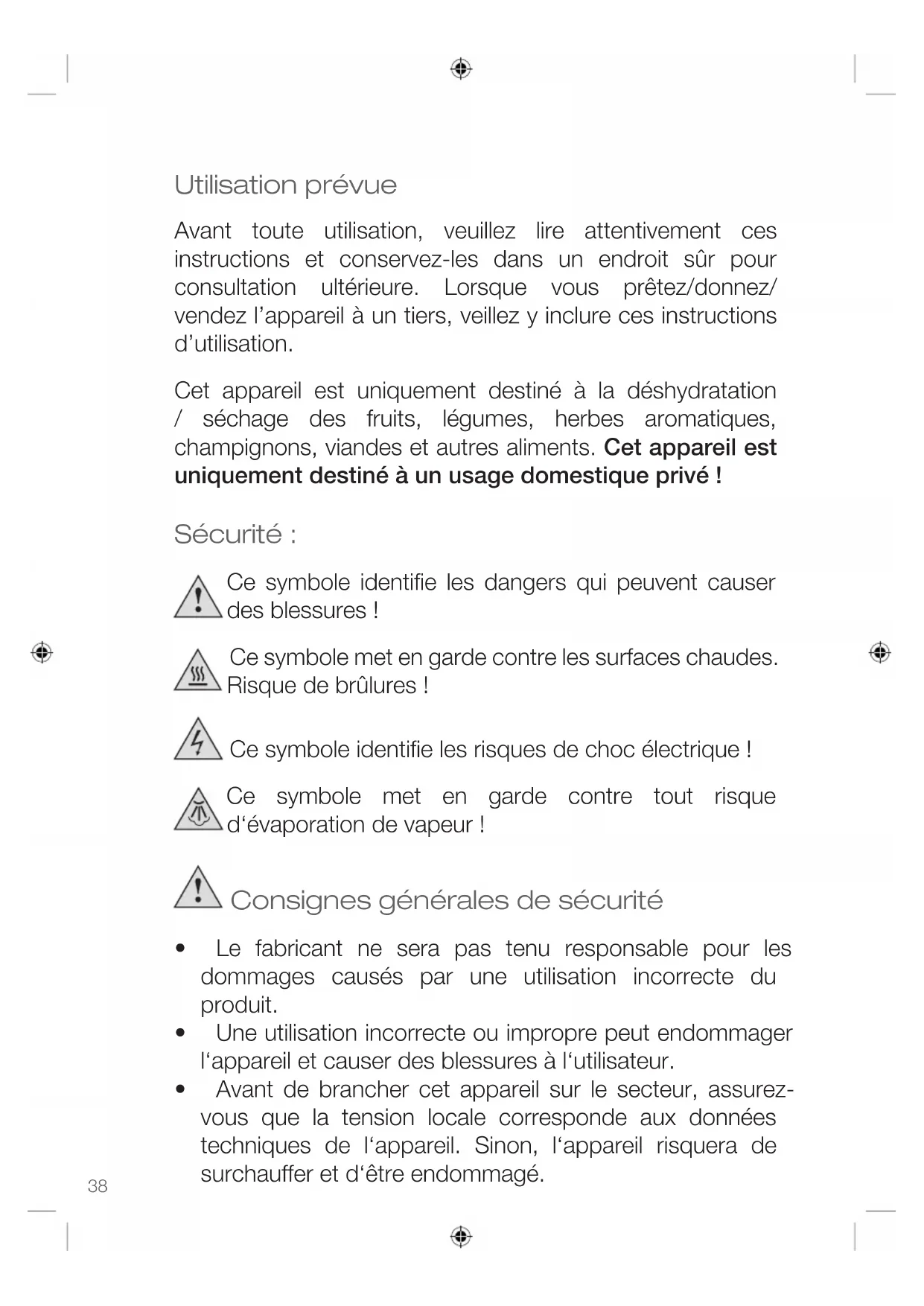- Utilisez l‘appareil uniquement pour l’usage prévu et tel que décrit dans ce manuel, par exemple déshydrater des fruits, légumes et autres produits alimentaires. Placez l‘appareil sur une surface plane et résistante à la chaleur.