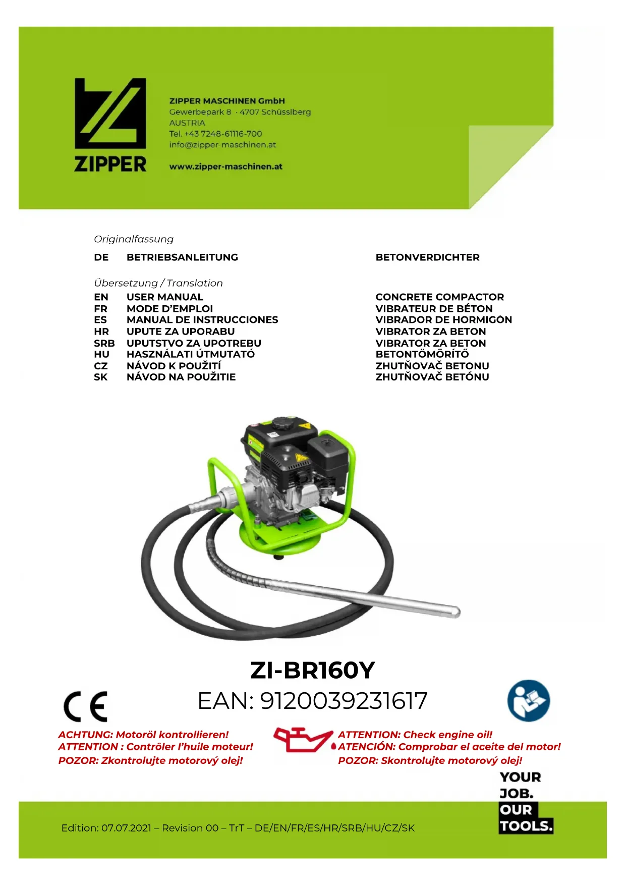 - Or use the online complaint order formula provided on our homepage – category service/news..DÉCLARATION DE GARANTIE (FR) ZIPPER MASCHINEN GmbH www.Zipper-Maschinen.at 81 ZI-BR160Y 53 DÉCLARATION DE GARANTIE (FR) 1.) Garantie: Les machines ZIPPER sont soumises à la garantie légale en vigueur dans la version actuelle. (Pour les composants électriques et mécaniques, cela correspond à 2 ans (à l'exception des pièces d'usure et des batteries/piles), à compter de l'acquisition par le consommateur final/l'acheteur. Pour les piles et les batteries, la garantie légale de 6 mois s'applique à compter de la date d'acquisition par le consommateur final/l'acheteur. Si des défauts surviennent dans ce délai, qui ne sont pas basés sur les détails d'exclusion mentionnés au point 3, la société Zipper réparera ou remplacera l'appareil à sa propre discrétion. 2.) Message Afin de vérifier la validité de la demande de garantie, l'acheteur doit contacter son revendeur, qui signalera le défaut à la société Zipper par écrit. Si la demande de garantie est justifiée, la société Zipper récupère l'appareil chez le revendeur. Les retours sans accord préalable avec la société Zipper ne seront pas acceptés. 3.) Dispositions a) Les demandes de garantie ne seront acceptées que si l'appareil est accompagné d'une copie de la facture originale ou d'un reçu de caisse du partenaire commercial de la société Zipper. La garantie est annulée si l'appareil n'est pas rapporté complet avec tous les accessoires pour la collecte. b) La garantie exclut les travaux gratuits de contrôle, de maintenance, d'inspection ou d’entretien sur l'équipement. Les défauts dus à une mauvaise utilisation par l'utilisateur final ou son revendeur ne seront pas non plus acceptés comme réclamation au titre de la garantie. Par ex. : Utilisation d'un mauvais carburant, dommages causés par le gel dans les réservoirs d'eau, carburant dans le réservoir de carburant de l'appareil pendant l'hiver. c) Les défauts des pièces d'usure tels que : les balais de charbon, les sacs collecteurs, les couteaux, les rouleaux, les plaques de coupe, les dispositifs de coupe, les guidages, les accouplements, les joints d'étanchéité, les rotors, les lames de scie, les croix de fendage, les coins de fendage, les extensions de coins de fendage, les huiles hydrauliques, les filtres à huile, à air et à essence, les chaînes, les bougies, les mâchoires coulissantes, etc. sont exclus. d) Sont exclus les dommages aux appareils causés par : Une utilisation incorrecte, un mauvais usage de l'appareil ; non conforme à son utilisation normale ; le non-respect des instructions d'utilisation et d'entretien ; la force majeure ; les réparations ou mes modifications techniques par des ateliers non autorisés ou par les clients eux-mêmes. En utilisant des pièces de rechange ou des accessoires non d'origine de la société Zipper. e) Les frais engagés (frais de transport) et les dépenses en cas de réclamations injustifiées au titre de la garantie sont à la charge du client ou du revendeur après inspection par notre personnel spécialisé. f) Appareils en dehors de la période de garantie : La réparation n'est effectuée qu'après paiement anticipé ou facture du revendeur selon le devis (frais de transport inclus) de la société Zipper. g) Les droits de garantie ne sont accordés qu'au client d'un revendeur Zipper qui a acheté l'appareil directement chez Zipper. Ces droits ne sont pas transférables si l'appareil est vendu plusieurs fois. 4.) Demandes de dommages-intérêts et autres responsabilités : La responsabilité de la société Zipper se limite dans tous les cas à la valeur marchande de l'appareil. Les droits à dommages-intérêts pour cause de mauvais fonctionnement, de défauts, ainsi que de dommages indirects ou de manque à gagner dus à un défaut pendant la période de garantie ne sont pas reconnus. La société Zipper insiste sur le droit légal de réparer un appareil. SERVICE Après l'expiration de la période de garantie, les travaux de réparation peuvent être effectués par des entreprises spécialisées appropriées. La société ZIPPER MASCHINEN GmbH se tient à votre disposition pour vous aider en matière de service et de réparation. Dans ce cas, faites une demande de devis sans engagement par e-mail à l'adresse service@zipper-maschinen.at. ou utilisez le formulaire de réclamation ou de commande de pièces de rechange en ligne mis à disposition sur notre page d'accueil - Catégorie SERVICE/ACTUALITÉS.DECLARACIÓN DE GARANTÍA (ES) ZIPPER MASCHINEN GmbH www.Zipper-Maschinen.at 82 ZI-BR160Y 54 DECLARACIÓN DE GARANTÍA (ES) 1.) Garantía: Las máquinas ZIPPER están sujetas a la garantía legal vigente en la versión actual. (Para los componentes eléctricos y mecánicos corresponde a 2 años (no incluye las piezas de desgaste ni los acumuladores/baterías), a partir de la fecha de compra por parte del usuario final/comprador. Para los acumuladores y las baterías se aplica el período de garantía legal de 6 meses a partir de la fecha de compra del usuario final/comprador. Si durante este período se producen defectos que no estén excluidos en los detalles enumerados en el punto 3, la empresa Zipper reparará o sustituirá el aparato a su discreción. 2.) Notificación Para comprobar la legitimidad de la reclamación de garantía, el comprador deberá ponerse en contacto con el distribuidor, que informará por escrito a la empresa Zipper del defecto que se ha producido. En caso de que la reclamación de garantía sea legítima, Zipper recogerá el aparato en el distribuidor. No se aceptarán las devoluciones que no hayan sido coordinadas previamente con la empresa Zipper. 3.) Disposiciones a) Sólo se aceptarán reclamaciones de garantía si se adjunta al aparato una copia de la factura original o del recibo de compra del socio comercial de Zipper. La reclamación de garantía expirar