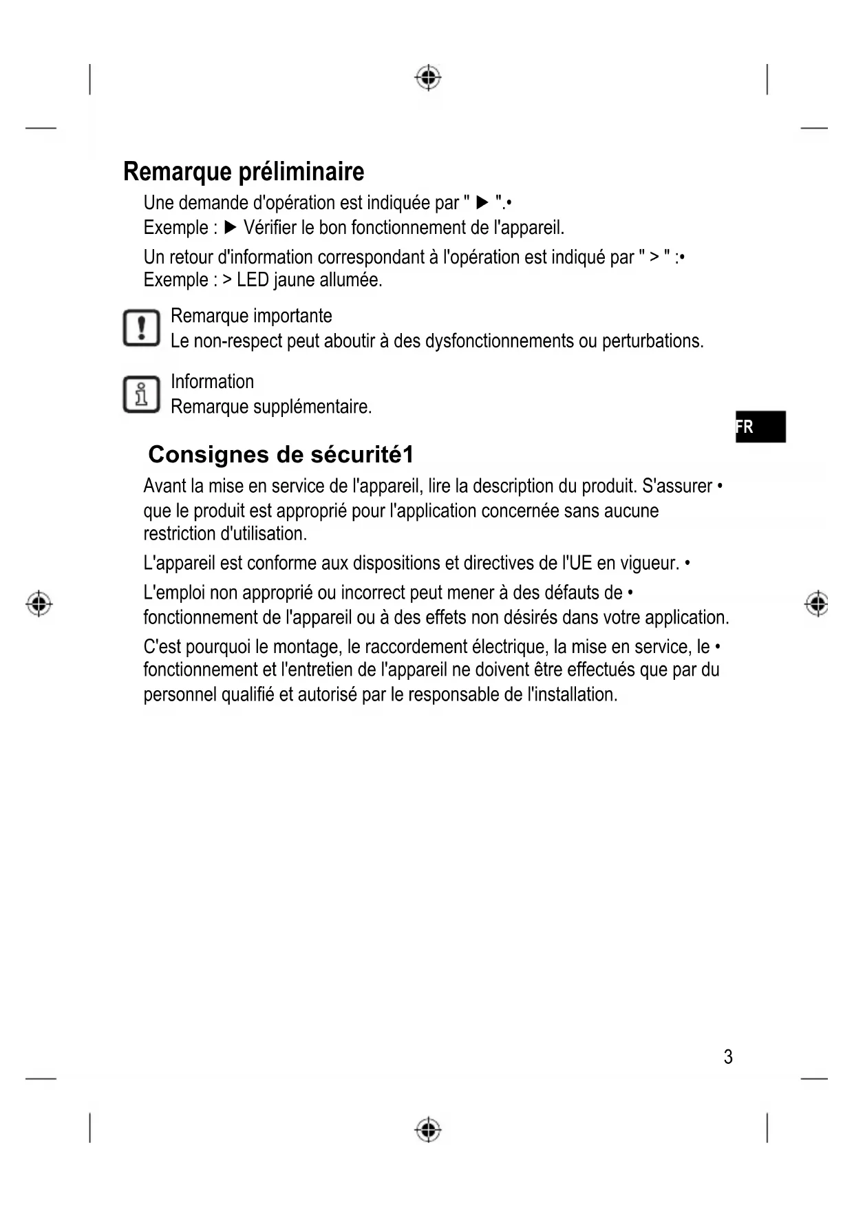 Remarque préliminaire Une demande d'opération est indiquée par " ► ".• Exemple : ► Vérifier le bon fonctionnement de l'appareil. Un retour d'information correspondant à l'opération est indiqué par " > " :• Exemple : > LED jaune allumée. Remarque importante Le non-respect peut aboutir à des dysfonctionnements ou perturbations. Information Remarque supplémentaire. Consignes de sécurité1 Avant la mise en service de l'appareil, lire la description du produit. S'assurer • que le produit est approprié pour l'application concernée sans aucune restriction d'utilisation. L'appareil est conforme aux dispositions et directives de l'UE en vigueur. • L'emploi non approprié ou incorrect peut mener à des défauts de • fonctionnement de l'appareil ou à des effets non désirés dans votre application. C'est pourquoi le montage, le raccordement électrique, la mise en service, le • fonctionnement et l'entretien de l'appareil ne doivent être effectués que par du personnel qualifié et autorisé par le responsable de l'installation.4 Fonctionnement et caractéristiques2 Le détecteur capacitif détecte sans contact les métaux, presque tous les • plastiques, le verre, la céramique, le bois, le papier, les huiles, les graisses, l'eau et tous les fluides aqueux et indique leur présence par un signal de commutation. Montage3 Remarques sur le montage encastré ou non encastré3.1 Si des appareils non encastrables sont montés de façon encastrée, la portée diminue jusqu'à ce que l'appareil commute (perte de fonctionnement). Respecter la zone de dégagement autour de la face active. ► 3xs