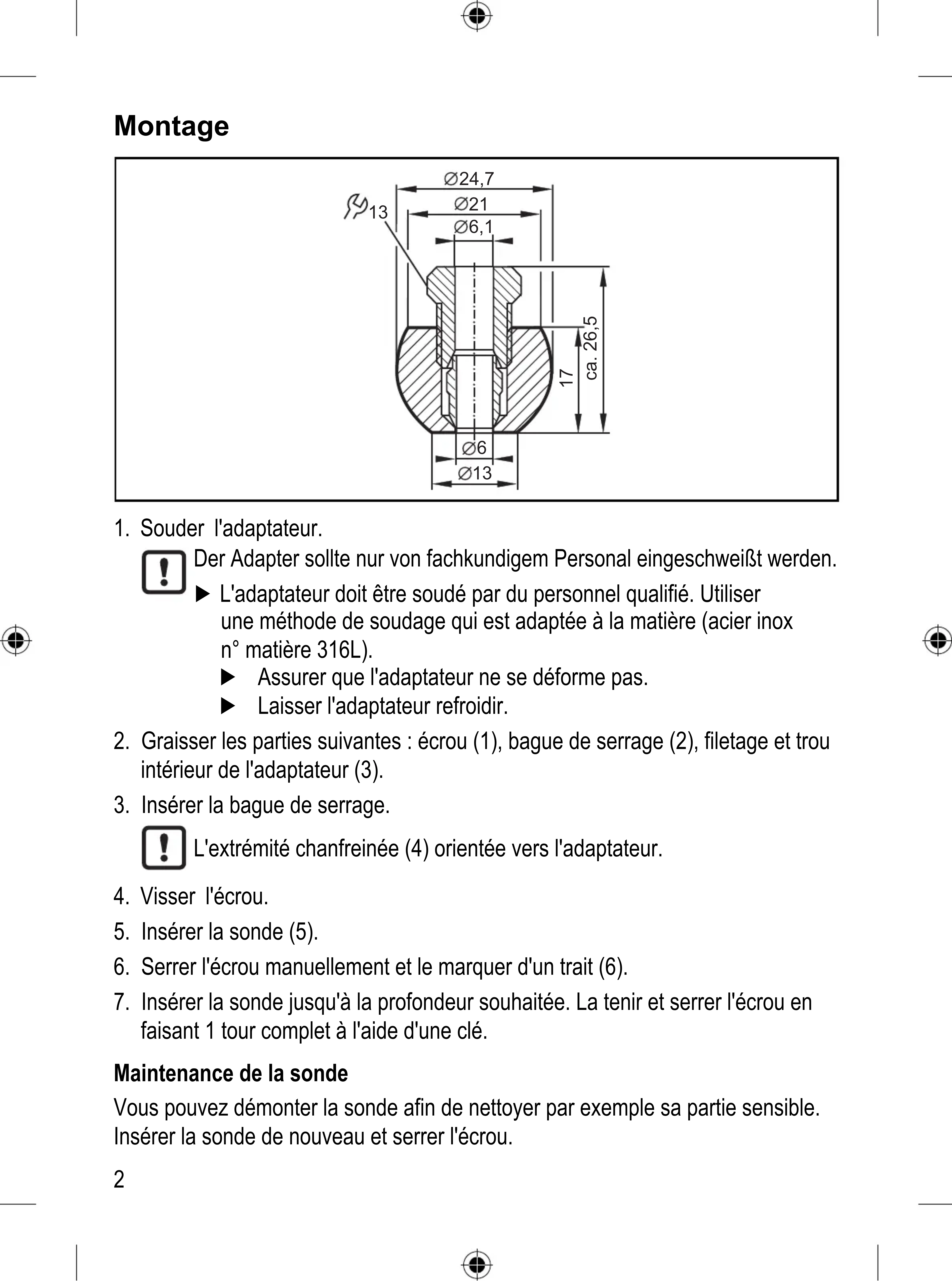 Der Adapter sollte nur von fachkundigem Personal eingeschweißt werden. ► L'adaptateur doit être soudé par du personnel qualifié. Utiliser une méthode de soudage qui est adaptée à la matière (acier inox n° matière 316L). ► Assurer que l'adaptateur ne se déforme pas. ► Laisser l'adaptateur refroidir.