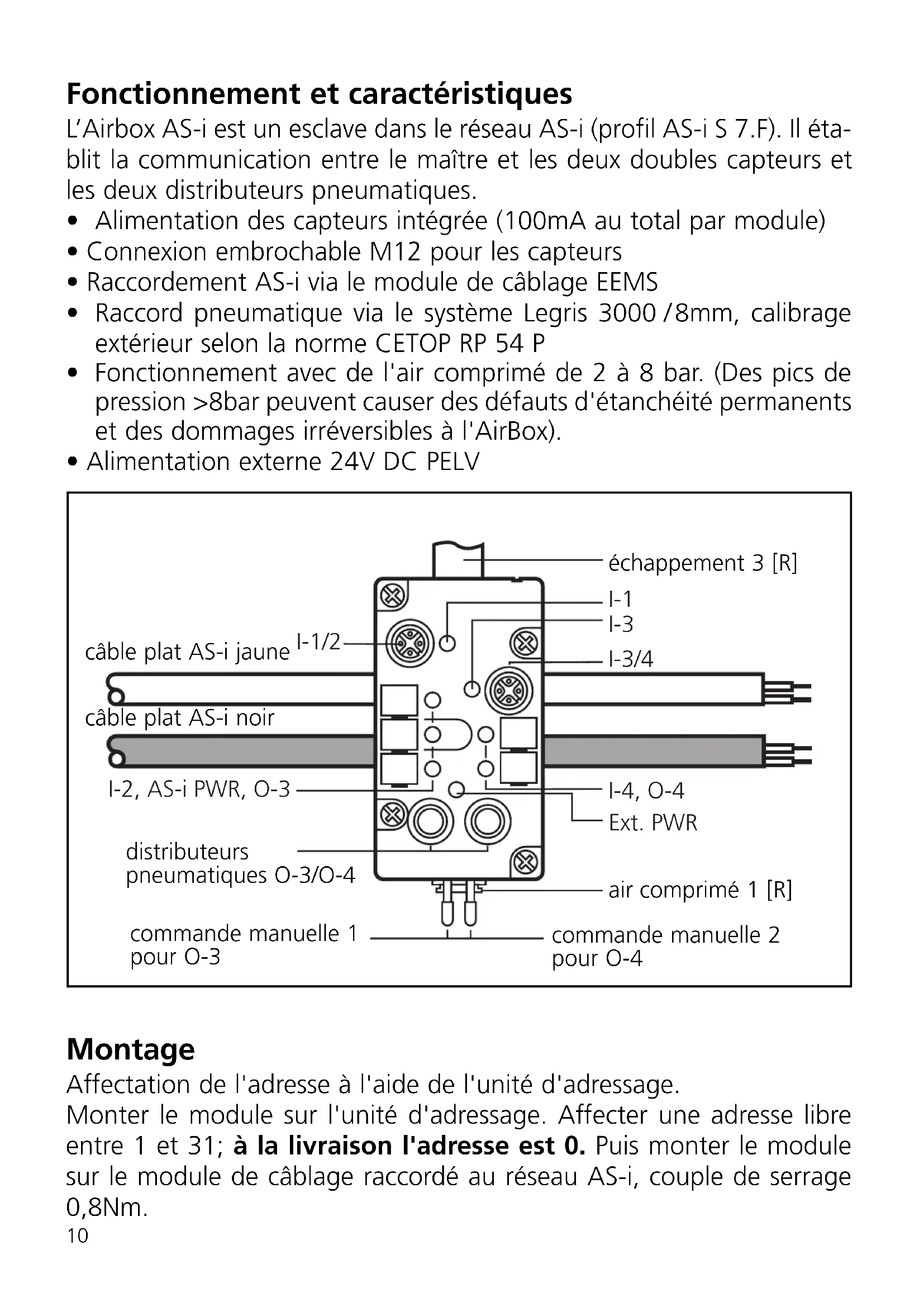 - Alimentation externe 24V DC PELV Montage Affectation de l'adresse à l'aide de l'unité d'adressage. Monter le module sur l'unité d'adressage. Affecter une adresse libre entre 1 et 31; à la livraison l'adresse est 0. Puis monter le module sur le module de câblage raccordé au réseau AS-i, couple de serrage 0,8Nm.