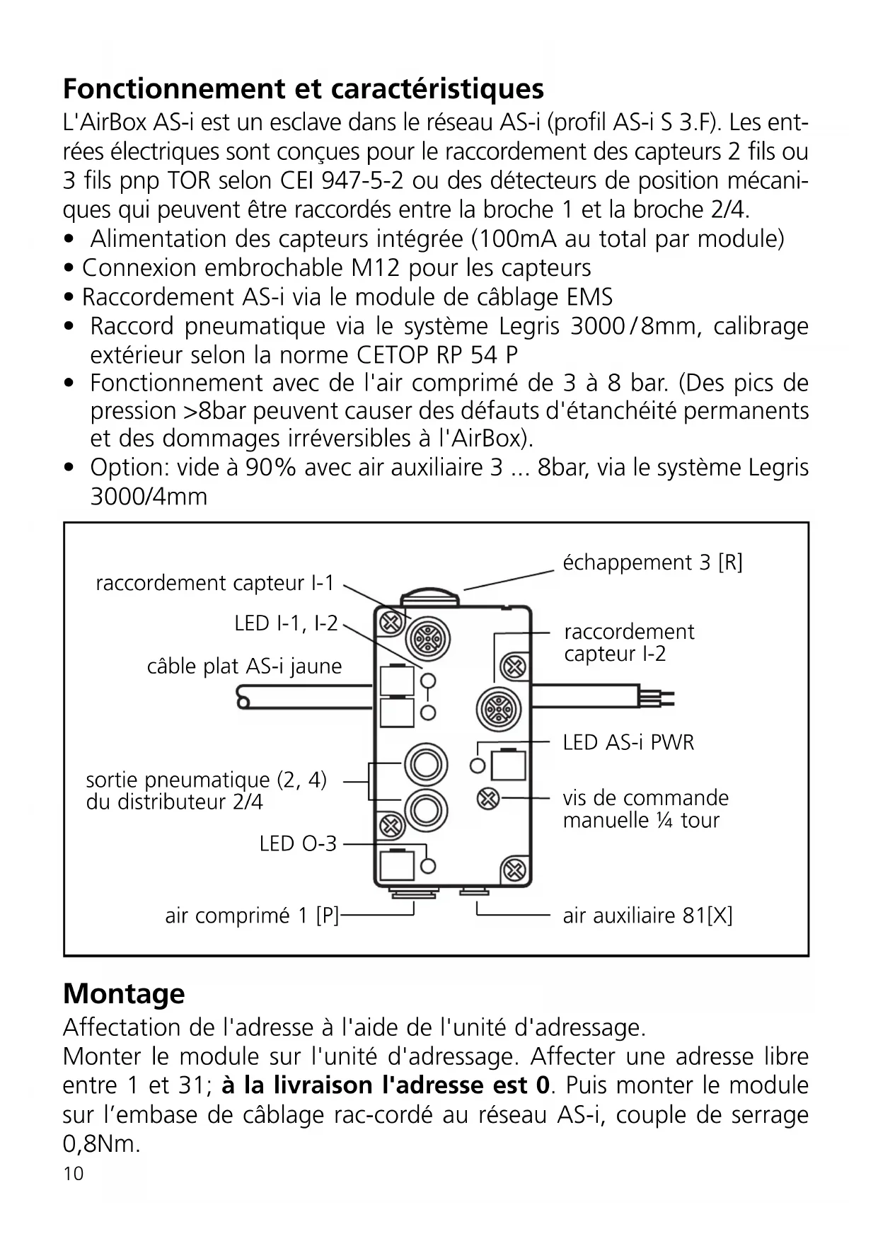 - Option: vide à 90% avec air auxiliaire 3 ... 8bar, via le système Legris 3000/4mm Montage Affectation de l'adresse à l'aide de l'unité d'adressage. Monter le module sur l'unité d'adressage. Affecter une adresse libre entre 1 et 31; à la livraison l'adresse est 0. Puis monter le module sur l’embase de câblage rac-cordé au réseau AS-i, couple de serrage 0,8Nm.
