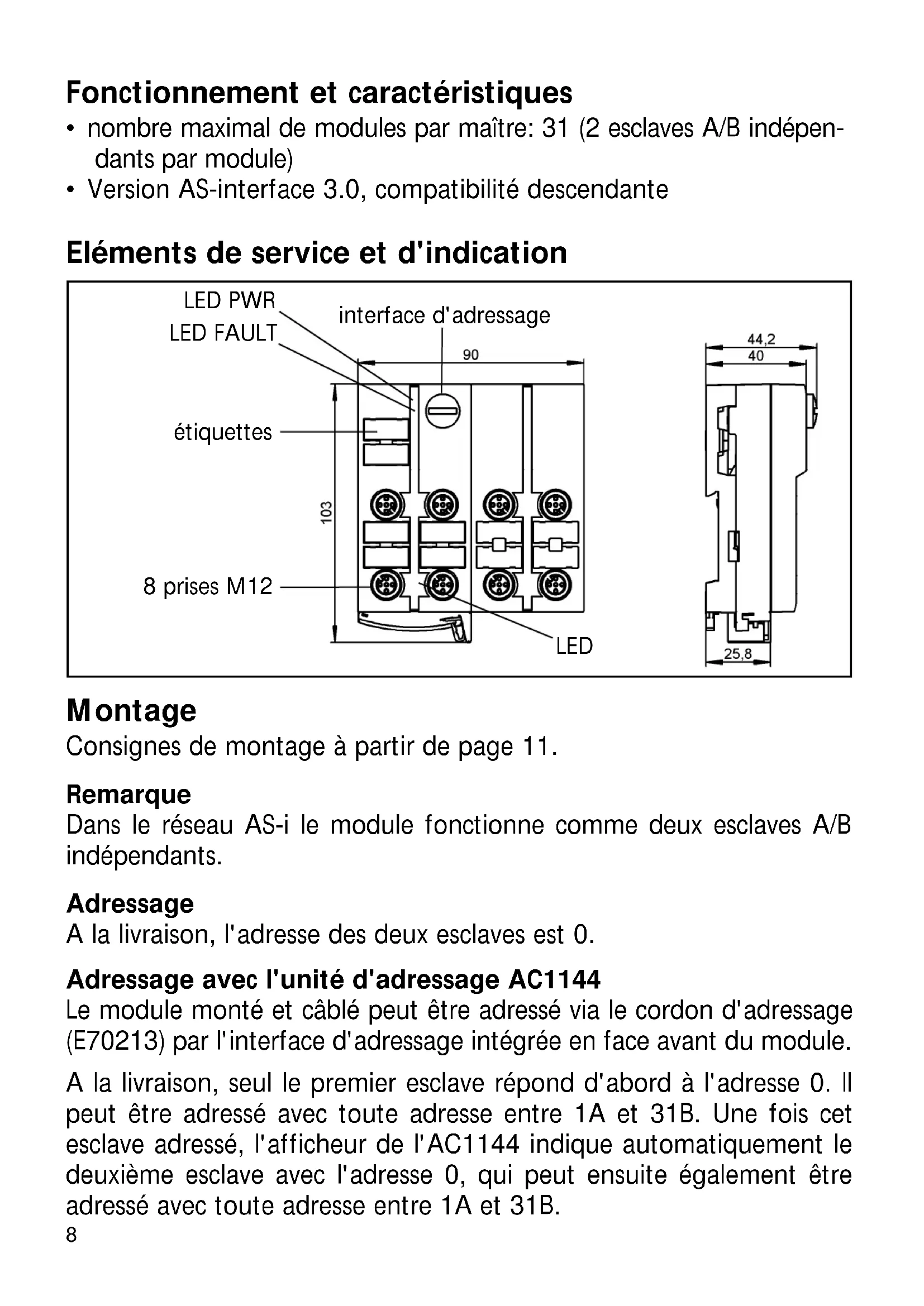 - Version AS-interface 3.0, compatibilité descendante Eléments de service et d'indication Montage Consignes de montage à partir de page 11. Remarque Dans le réseau AS-i le module fonctionne comme deux esclaves A/B indépendants. Adressage A la livraison, l'adresse des deux esclaves est 0. Adressage avec l'unité d'adressage AC1144 Le module monté et câblé peut être adressé via le cordon d'adressage (E70213) par l'interface d'adressage intégrée en face avant du module. A la livraison, seul le premier esclave répond d'abord à l'adresse 0. Il peut être adressé avec toute adresse entre 1A et 31B. Une fois cet esclave adressé, l'afficheur de l'AC1144 indique automatiquement le deuxième esclave avec l'adresse 0, qui peut ensuite également être adressé avec toute adresse entre 1A et 31B.