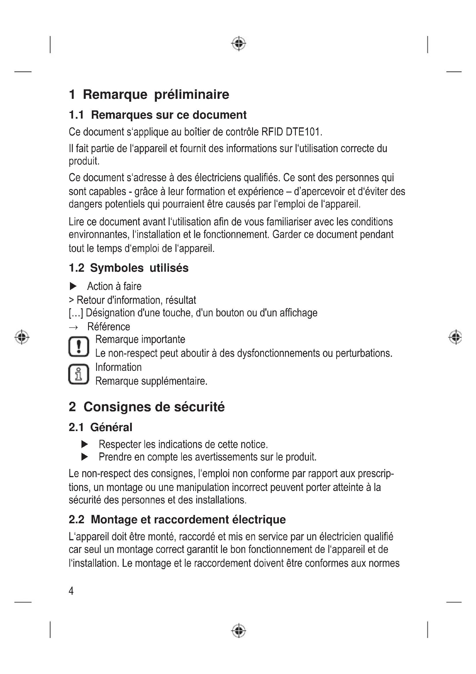 Ce document s‘applique au boîtier de contrôle RFID DTE101. Il fait partie de l‘appareil et fournit des informations sur l‘utilisation correcte du produit. Ce document s‘adresse à des électriciens qualifiés. Ce sont des personnes qui sont capables - grâce à leur formation et expérience – d’apercevoir et d‘éviter des dangers potentiels qui pourraient être causés par l‘emploi de l‘appareil. Lire ce document avant l‘utilisation afin de vous familiariser avec les conditions environnantes, l‘installation et le fonctionnement. Garder ce document pendant tout le temps d‘emploi de l‘appareil.