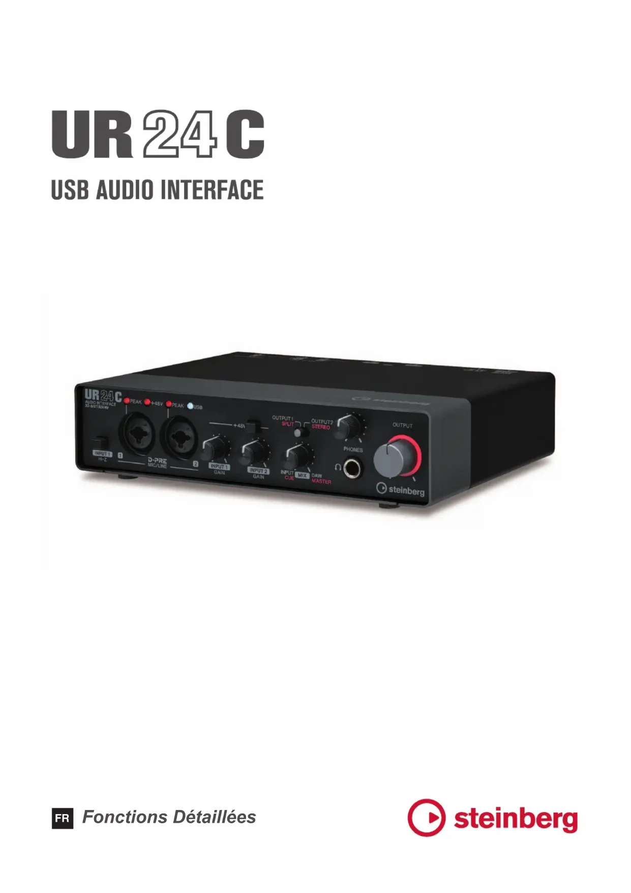 - Prenez soin d'utiliser le câble USB fourni.• Afin de connecter le périphérique au port USB Type-C d'un ordinateur, utilisez un câble USB3.1 Type-C vers Type-C disponible dans le commerce. Le voyant USB clignote en continu Le disque TOOLS for UR-C a-t-il été correctement installé ? (ordinateur uniquement) Ce voyant clignote en continu lorsque l'ordinateur ou l'appareil iOS/iPadOS ne reconnaît pas le périphérique. Reportez-vous aux instructions du Guide de démarrage pour terminer l'installation du logiciel TOOLS for UR-C. Absence de son Le disque TOOLS for UR-C a-t-il été correctement installé ? (ordinateur uniquement) Ce voyant clignote en continu lorsque l'ordinateur ou l'appareil iOS/iPadOS ne reconnaît pas le périphérique. Reportez-vous aux instructions du Guide de démarrage pour terminer l'installation du logiciel TOOLS for UR-C. Vérifiez si le câble USB utilisé est approprié. Prenez soin d'utiliser le câble USB fourni. Les commandes de volume du périphérique sont-elles réglées sur un niveau sonore approprié ? Vérifiez les niveaux de réglage des boutons [OUTPUT] et [PHONES]. Les microphones et les haut-parleurs de contrôle sont-ils correctement connectés au périphérique ? Reportez-vous à la section « Exemples de connexion » (pages 23, 27) pour vérifier les branchements. Les réglages du pilote audio dans l'application DAW sont-ils correctement spécifiés ? Pour vérifier ces réglages, reportez-vous à la section « Configuration des réglages du pilote audio dans le logiciel DAW » (page 24). Le réglage du [Pilote ASIO] du programme de la série Cubase est-il correctement défini ? Depuis le menu de la série Cubase, ouvrez [Studio] [Configuration du studio] [Système Audio VST], puis vérifiez que l'élément [Yamaha Steinberg USB ASIO] (Windows) ou [Steinberg UR24C] ou [Steinberg UR24C (High Precision)] (Mac) a été sélectionné sous [Pilote ASIO]. Le périphérique était-il sous tension avant le lancement du logiciel DAW ? Avant de démarrer l'application DAW, connectez le périphérique à l'ordinateur puis mettez-le sous tension. L'entrée/sortie de l'acheminement est-elle correctement réglée ? Reportez-vous à la section « Enregistrement/reproduction » (page 25) pour vérifier l'acheminement de l'entrée/sortie dans DAW.Dépistage des pannes UR24C Fonctions Détaillées 32 Pour obtenir les dernières informations d'aide relatives au produit, consultez le site Web de Steinberg, à l'adresse suivante : https://www.steinberg.fr/ Absence de son Les haut-parleurs de contrôle sont-ils activés ? Vérifiez que le commutateur des haut-parleurs de contrôle est activé. Le réglage du Monitor mode est-il approprié ? Reportez-vous à la section « Monitor mode » (page 30) et vérifiez le Monitor mode, le commutateur à glissière et le réglage du bouton MIX. Selon les réglages, il est possible qu'il n'y ait pas de son provenant du casque ou que seul le son de gauche ou le son de droite soit audible. Le réglage de la taille de la mémoire tampon est-il trop faible ? Augmentez la taille de la mémoire tampon par rapport à son réglage actuel ; reportez-vous à la section « Yamaha Steinberg USB Driver » (page 6) pour obtenir les instructions nécessaires. Le message d'erreur « Audio Format is Unmixable » s'affiche-t-il ? (Mac uniquement) Le message d'erreur « Audio Format is Unmixable » s'affiche dans le tableau de bord de Yamaha Steinberg USB. Cliquez sur [Revert to Mixable] pour corriger l'erreur. Son inhabituel (bruit, coupure ou déformation) Votre ordinateur est-il conforme à la configuration minimale requise ? Vérifiez si la configuration minimale requise est respectée. Pour obtenir les dernières informations, consultez le site Web de Steinberg, dont l'adresse est fournie ci-dessous : https://www.steinberg.fr/ Le mode USB est-il réglé correctement ? Selon le contrôleur d'hôte USB installé sur l'ordinateur, il est possible qu'un décrochage audio survienne en cas d'utilisation du mode SuperSpeed (USB 3.1 Gen1). Le cas échéant, essayez de basculer vers le mode USB 2.0 haute vitesse sur le tableau de bord de Yamaha Steinberg USB Driver. Reproduisez-vous ou enregistrez-vous actuellement des sections audio longues en continu ? Les capacités de traitement des données audio de votre ordinateur dépendent de plusieurs facteurs, dont la vitesse de l'unité centrale et l'accès aux périphériques externes. Réduisez le nombre de pistes audio, puis contrôlez à nouveau le son. Les microphones sont-ils correctement connectés au périphérique ? Connectez un microphone au périphérique via un connecteur XLR. Si vous utilisez à cet effet un connecteur de type jack, le volume pourra s'avérer insuffisant. La fonction Loopback est-elle réglée correctement ? Désactivez la fonction Enable Loopback lorsq.ue la fonction Loopback est inutilisée. Pour les instructions, reportez-vous à la section « Fenêtre Settings » (page 11). Le message d'erreur « Audio Format is Unmixable » s'affiche-t-il ? (Mac uniquement) Le message d'erreur « Audio Format is Unmixable » s'affiche dans le tableau de bord de Yamaha Steinberg USB. Cliquez sur [Revert to Mixable] pour corriger l'erreur.Annexe UR24C Fonctions Détaillées 33 Annexe Limitation de l'utilisation des effets Deux effets Channel Strip et un effet Guitar Amp Classics sont proposés sur l'interface UR24C. L'utilisation simultanée des effets Channel Strip et Guitar Amp Classics sur le même canal est possible car il existe deux logements qui servent à insérer les effets dans les différents canaux d'entrée. Cependant, les restrictions suivantes s'appliquent.