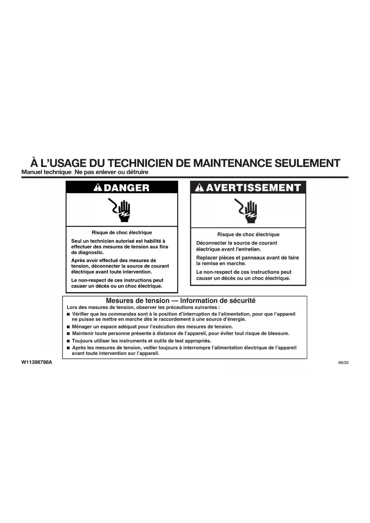 DO NOT REMOVE OR DESTROYÀ L’USAGE DU TECHNICIEN DE MAINTENANCE SEULEMENT Manuel technique Ne pas enlever ou détruire W11398798A08/20 AVERTISSEMENT Risque de choc électriqueDéconnecter la source de courant électrique avant l'entretien.Replacer pièces et panneaux avant de faire la remise en marche.Le non-respect de ces instructions peut causer un décès ou un choc électrique. DANGER Risque de choc électriqueSeul un technicien autorisé est habilité à effectuer des mesures de tension aux fins de diagnostic.Après avoir effectué des mesures de tension, déconnecter la source de courant électrique avant toute intervention.Le non-respect de ces instructions peut causer un décès ou un choc électrique. Mesures de tension — Information de sécurité Lors des mesures de tension, observer les précautions suivantes : ■ Vérifier que les commandes sont à la position d’interruption de l’alimentation, pour que l’appareil ne puisse se mettre en marche dès le raccordement à une source d’énergie.■ Ménager un espace adéquat pour l’exécution des mesures de tension. ■ Maintenir toute personne présente à distance de l’appareil, pour éviter tout risque de blessure. ■ Toujours utiliser les instruments et outils de test appropriés. ■ Après les mesures de tension, veiller toujours à interrompre l’alimentation électrique de l’appareil avant toute intervention sur l’appareil.À L’USAGE DU TECHNICIEN DE MAINTENANCE SEULEMENT