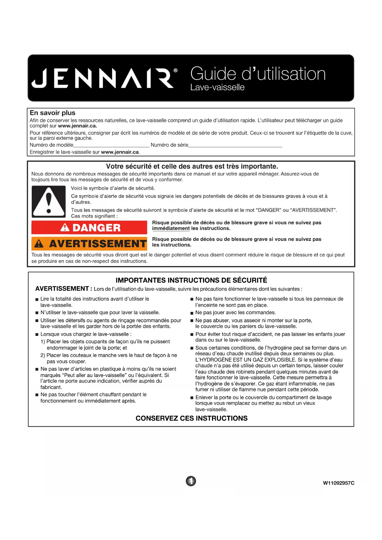 Lire la totalité des instructions avant d’utiliser le lave-vaisselle.■ N’utiliser le lave-vaisselle que pour laver la vaisselle. Utiliser les détersifs ou agents de rinçage recommandés pour lave-vaisselle et les garder hors de la portée des enfants.■ Lorsque vous chargez le lave-vaisselle :1) Placer les objets coupants de façon qu’ils ne puissent endommager le joint de la porte; et2) Placer les couteaux le manche vers le haut de façon à ne pas vous couper.■ Ne pas laver d’articles en plastique à moins qu’ils ne soient marqués “Peut aller au lave-vaisselle” ou l’équivalent. Si l’article ne porte aucune indication, vérifier auprès du fabricant.■ Ne pas toucher l’élément chauffant pendant le fonctionnement ou immédiatement après.■ Ne pas faire fonctionner le lave-vaisselle si tous les panneaux de l’enceinte ne sont pas en place. Ne pas jouer avec les commandes. Ne pas abuser, vous asseoir ni monter sur la porte, le couvercle ou les paniers du lave-vaisselle.■ Pour éviter tout risque d’accident, ne pas laisser les enfants jouer dans ou sur le lave-vaisselle.■ Sous certaines conditions, de l’hydrogène peut se former dans un réseau d’eau chaude inutilisé depuis deux semaines ou plus. L’HYDROGÈNE EST UN GAZ EXPLOSIBLE. Si le système d’eau chaude n’a pas été utilisé depuis un certain temps, laisser couler l’eau chaude des robinets pendant quelques minutes avant de faire fonctionner le lave-vaisselle. Cette mesure permettra à l’hydrogène de s’évaporer. Ce gaz étant inflammable, ne pas fumer ni utiliser de flamme nue pendant cette période.■ Enlever la porte ou le couvercle du compartiment de lavage lorsque vous remplacez ou mettez au rebut un vieux lave-vaisselle.W11092957C