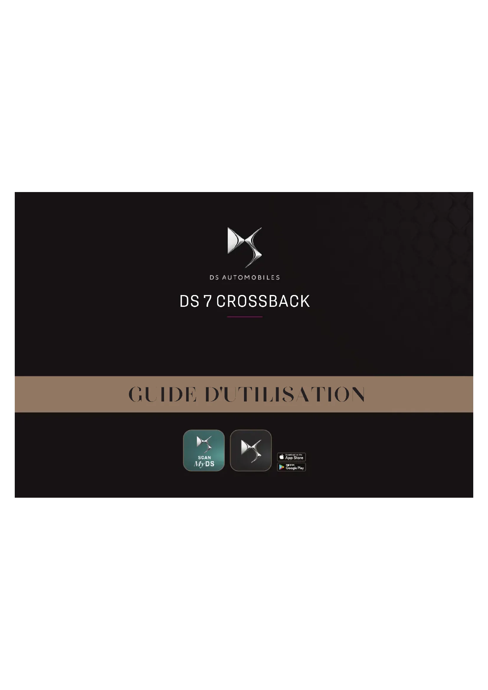 Sélectionner: – la langue, – le véhicule, sa silhouette, – la période d'édition du guide d'utilisation correspondant à la date de la 1 ère mise en circulation du véhicule. APPLICATIONS MOBILES Installer l’application Scan MyDS (contenu disponible hors connexion). Disponible aussi sur l'application MyDS App.BIENVENUE Nous vous remercions d'avoir choisi DS 7 CROSSBACK. Ce document présente les informations et recommandations indispensables à la découverte de votre véhicule, en toute sécurité. Il est fortement recommandé d'en prendre connaissance ainsi que du carnet d'entretien. Votre véhicule reprend une partie des équipements décrits dans ce document, en fonction du niveau de finition, de la version et des caractéristiques propres au pays de commercialisation. Les descriptions et figures sont fournies sans engagement. La marque DS AUTOMOBILES est commercialisée par Automobiles CITROËN, société anonyme au capital social de 159.000.000 euros dont le siège social est situé 2-10 boulevard de l'Europe, 78300 POISSY, et immatriculée auprès du RCS de Versailles sous le numéro 642 050 199, ci-après dénommée le "Constructeur", qui se réserve le droit de modifier les caractéristiques techniques, équipements et accessoires sans être tenu de mettre à jour le présent document. En cas de cession de votre véhicule, penser à remettre ce Guide d'utilisation au nouveau propriétaire. Légende Avertissement pour la sécurité Information complémentaire Contribution à la protection de la nature Véhicule avec poste de conduite à gauche Véhicule avec poste de conduite à droite Localisation par une zone noire de l'équipement/ du bouton décrit Pour toute intervention sur votre véhicule, s'adresser au réseau du Constructeur, ci-après dénommé le "Réseau", ou à un atelier qualifié.2 Sommaire