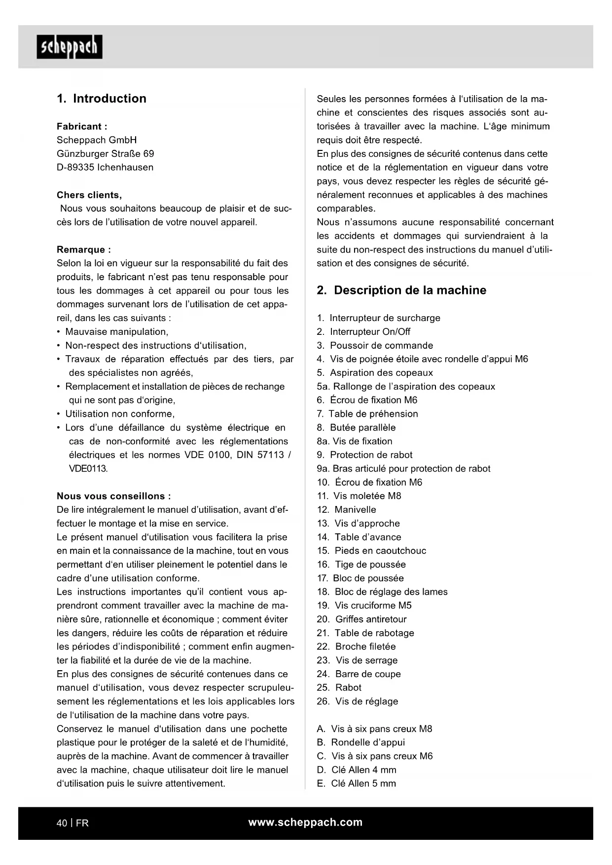 - Lors d’une défaillance du système électrique en cas de non-conformité avec les réglementations électriques et les normes VDE 0100, DIN 57113 / VDE0113. Nous vous conseillons : De lire intégralement le manuel d’utilisation, avant d’ef- fectuer le montage et la mise en service. Le présent manuel d‘utilisation vous facilitera la prise en main et la connaissance de la machine, tout en vous permettant d‘en utiliser pleinement le potentiel dans le cadre d’une utilisation conforme. Les instructions importantes qu’il contient vous ap- prendront comment travailler avec la machine de ma- nière sûre, rationnelle et économique ; comment éviter les dangers, réduire les coûts de réparation et réduire les périodes d’indisponibilité ; comment enn augmen- ter la abilité et la durée de vie de la machine. En plus des consignes de sécurité contenues dans ce manuel d‘utilisation, vous devez respecter scrupuleu- sement les réglementations et les lois applicables lors de l‘utilisation de la machine dans votre pays. Conservez le manuel d‘utilisation dans une pochette plastique pour le protéger de la saleté et de l‘humidité, auprès de la machine. Avant de commencer à travailler avec la machine, chaque utilisateur doit lire le manuel d‘utilisation puis le suivre attentivement.www.scheppach.com