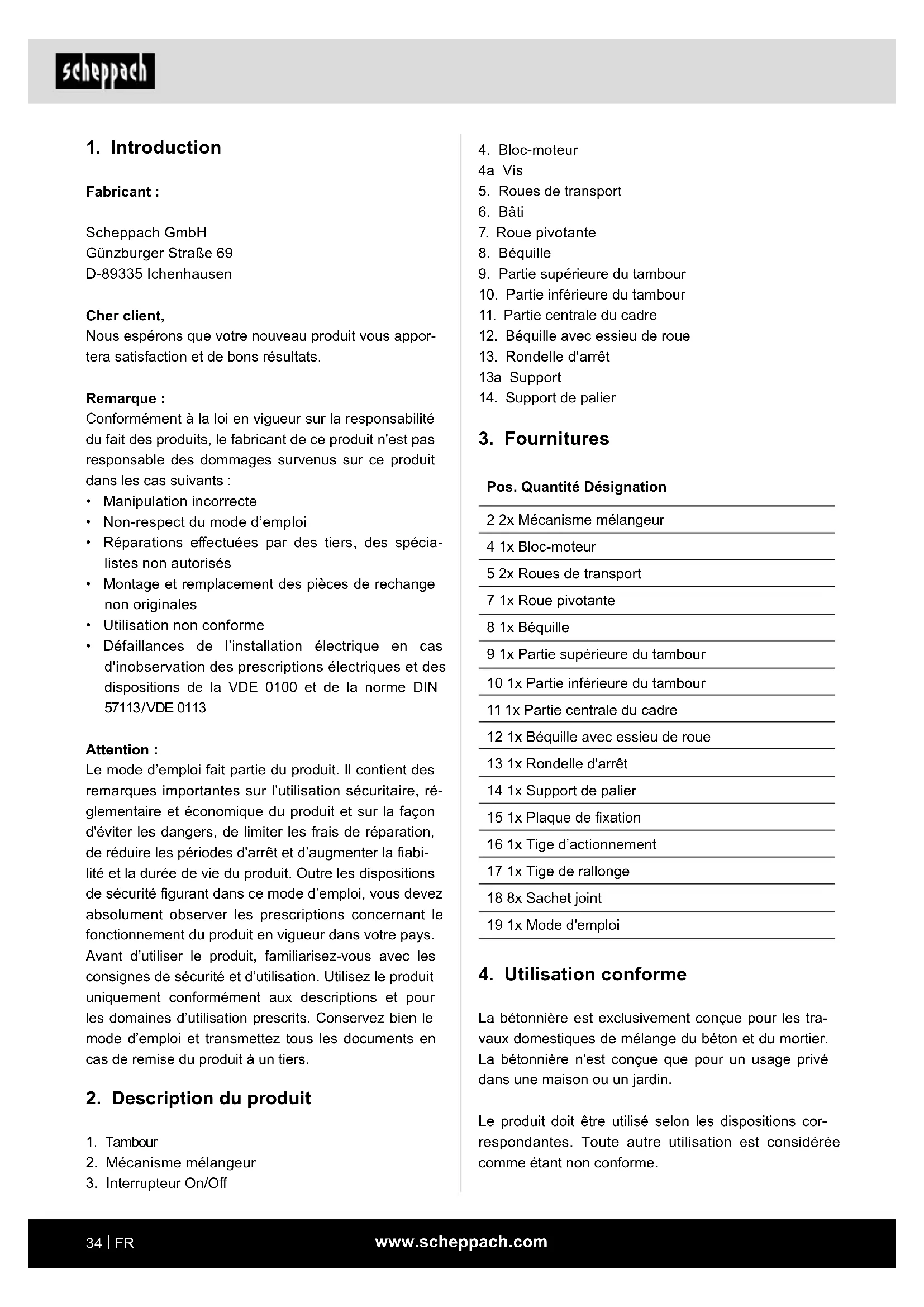 Fabricant : Scheppach GmbH Günzburger Straße 69 D-89335 Ichenhausen Cher client, Nous espérons que votre nouveau produit vous appor- tera satisfaction et de bons résultats. Remarque : Conformément à la loi en vigueur sur la responsabilité du fait des produits, le fabricant de ce produit n'est pas responsable des dommages survenus sur ce produit dans les cas suivants :
