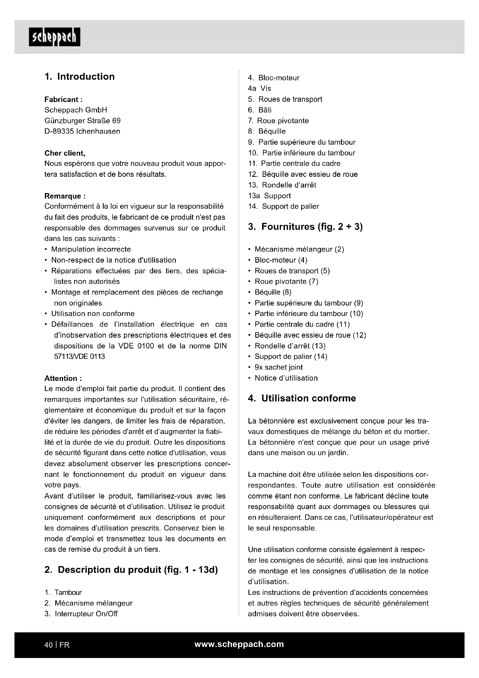 Fabricant : Scheppach GmbH Günzburger Straße 69 D-89335 Ichenhausen Cher client, Nous espérons que votre nouveau produit vous appor- tera satisfaction et de bons résultats. Remarque : Conformément à la loi en vigueur sur la responsabilité du fait des produits, le fabricant de ce produit n'est pas responsable des dommages survenus sur ce produit dans les cas suivants :