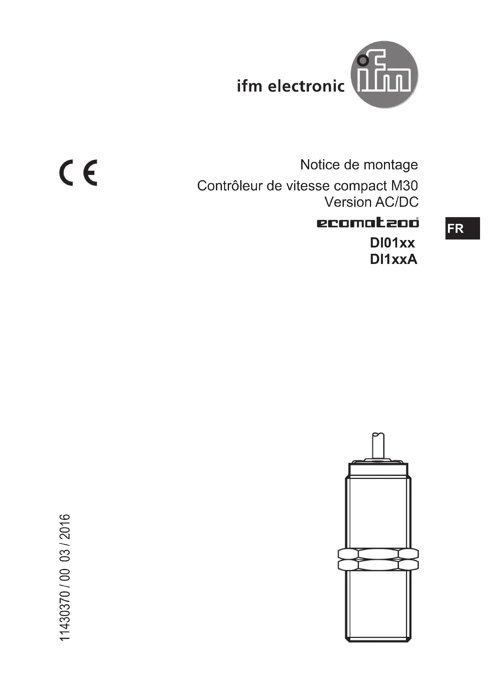 Notice de montage Contrôleur de vitesse compact M30 Version AC/DC DI01xx DI1xxA 11430370 / 00 03 / 2016 FR2 1 Remarques préliminaires Ce document s'applique à tous les appareils du type " contrôleur de vitesse compact" (référence : DI01xx et DI1xxA). Ce document s'adresse à des personnes compétentes. Ce sont des personnes qui sont capables – grâce à leur formation et expérience – d’appréhender les risques et d'éviter les dangers potentiels qui pourraient être causés par le fonctionnement, l'installation ou la maintenance de l'appareil. Lire ce document avant l'utilisation afin de vous familiariser avec les conditions d'utilisation, l'installation et le fonctionnement. Garder ce document pendant tout le temps d'emploi de l'appareil. AVERTISSEMENT Respecter les avertissements et consignes de sécurité (→ 2 Consignes de sécurité). Contenu 1 Remarques préliminaires .....................................................................................2