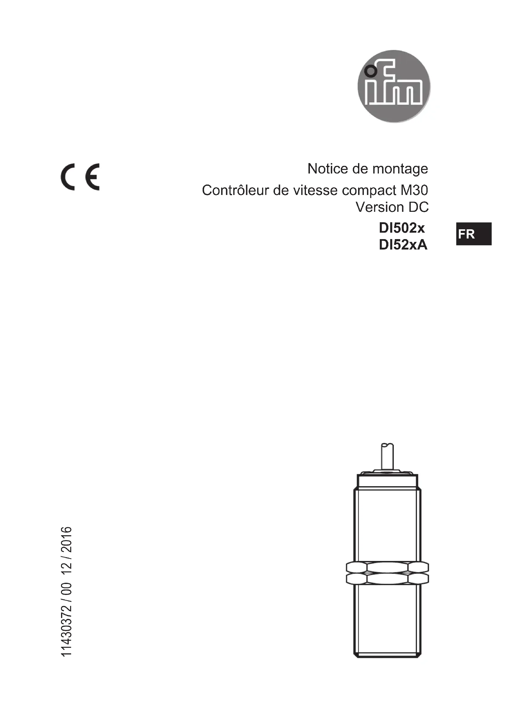 Notice de montage Contrôleur de vitesse compact M30 Version DC DI502x DI52xA 11430372 / 00 12 / 2016 FR2 Contenu 1 Remarque préliminaire 3 11 Symboles utilisés et avertissements 3 2 Consignes de sécurité 4 21 Appareils ATEX (DI52xA) 4 3 Fonctionnement et caractéristiques 4 31 Fonction de commutation normalement ouvert 4 32 Fonction de commutation normalement fermé 4 33 Amortissement 5 34 Diagramme fonctionnel 5 35 IO-Link 6 4 Montage 6 5 Raccordement électrique 7 51 Schéma de branchement 7 6 Réglage 8 61 Réglage pour la fonction de commutation normalement ouvert 8 62 Réglage pour la fonction de commutation normalement fermé 8 7 Fonctionnement 9 8 Données techniques 103