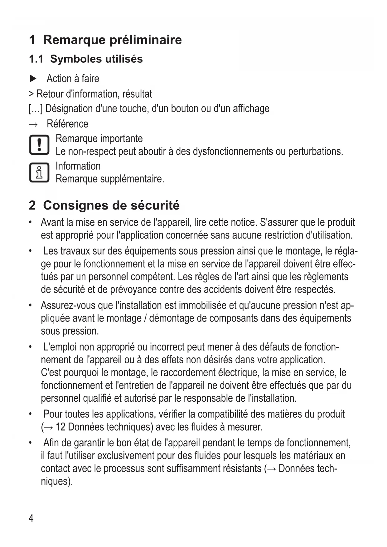 - Afin de garantir le bon état de l'appareil pendant le temps de fonctionnement, il faut l'utiliser exclusivement pour des fluides pour lesquels les matériaux en contactavecleprocessussontsuffisammentrésistants(→Donnéestech- niques)5