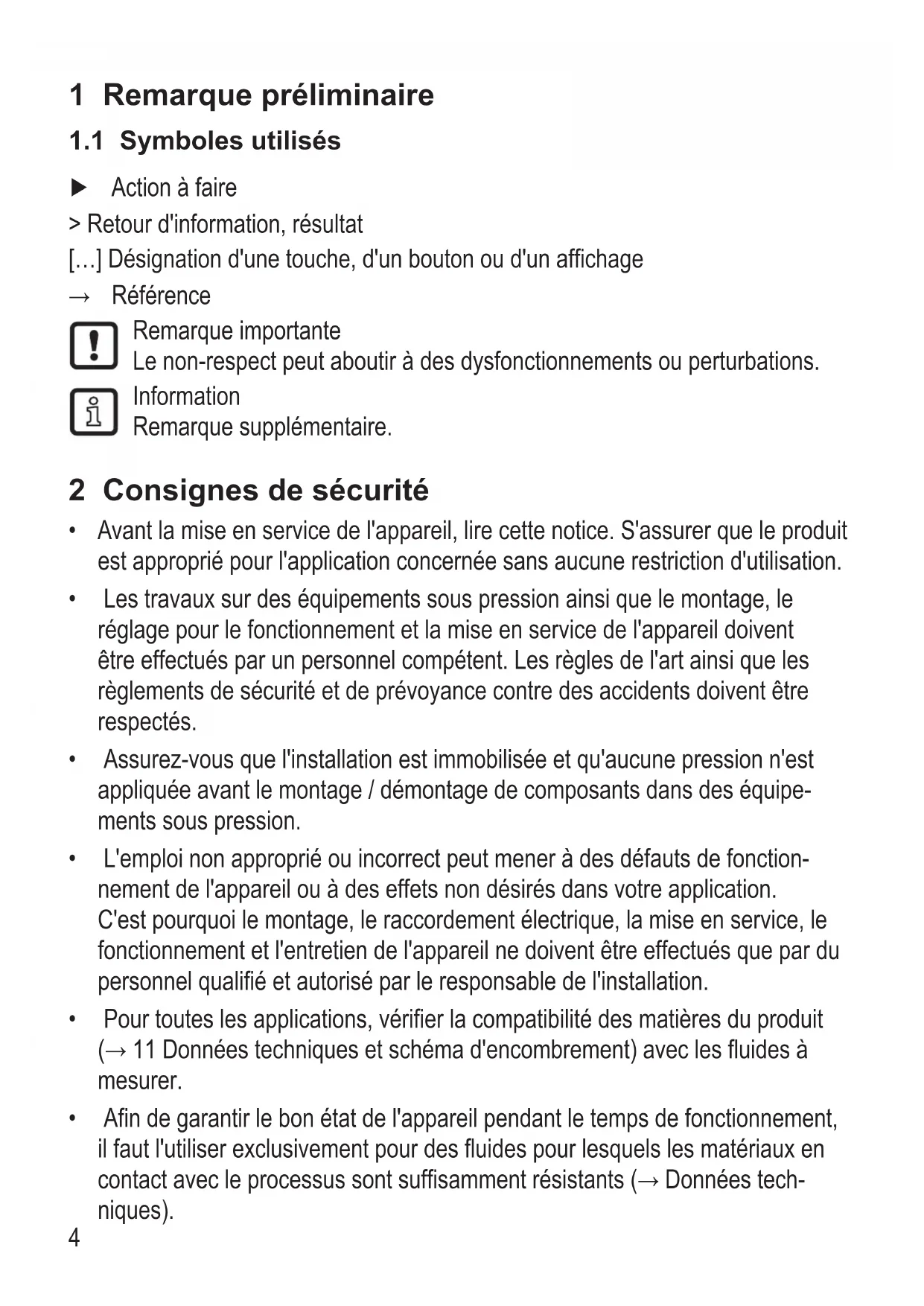 - Afin de garantir le bon état de l'appareil pendant le temps de fonctionnement, il faut l'utiliser exclusivement pour des fluides pour lesquels les matériaux en contactavecleprocessussontsuffisammentrésistants(→Donnéestech- niques)5