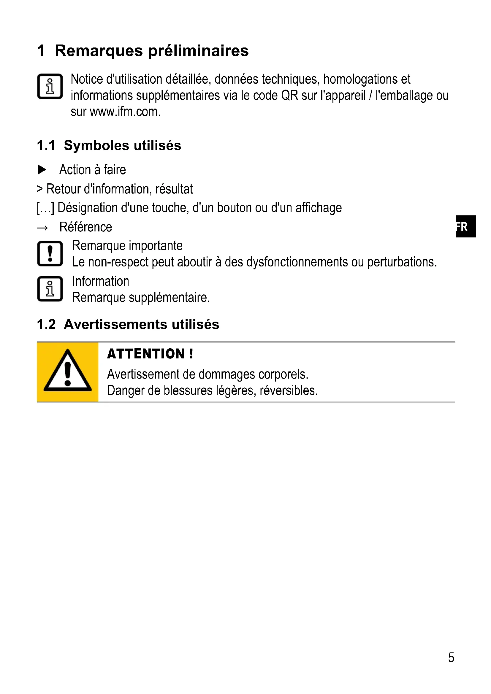 1 Remarques préliminaires Notice d'utilisation détaillée, données techniques, homologations et informations supplémentaires via le code QR sur l'appareil / l'emballage ou sur wwwifmcom