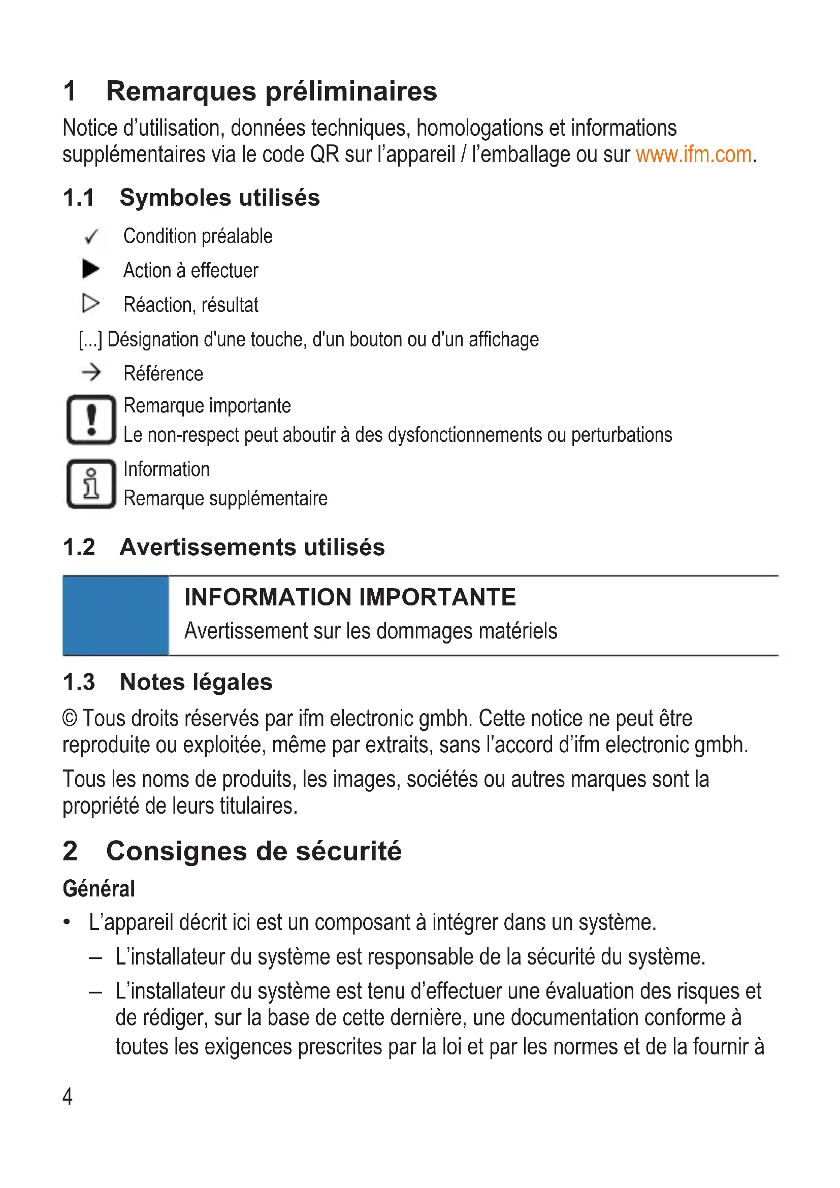 10 Maintenance, réparation et élimination........................................................... 65 11 Homologations / Normes ................................................................................ 65 Glossaire......................................................................................................... 674 1 Remarques préliminaires Notice d’utilisation, données techniques, homologations et informations supplémentaires via le code QR sur l’appareil / l’emballage ou sur www.ifm.com. 1.1 Symboles utilisés Condition préalable Action à effectuer Réaction, résultat [...] Désignation d'une touche, d'un bouton ou d'un affichage Référence Remarque importante Le non-respect peut aboutir à des dysfonctionnements ou perturbations Information Remarque supplémentaire 1.2 Avertissements utilisés INFORMATION IMPORTANTE Avertissement sur les dommages matériels 1.3 Notes légales © Tous droits réservés par ifm electronic gmbh. Cette notice ne peut être reproduite ou exploitée, même par extraits, sans l’accord d’ifm electronic gmbh. Tous les noms de produits, les images, sociétés ou autres marques sont la propriété de leurs titulaires. 2 Consignes de sécurité Général