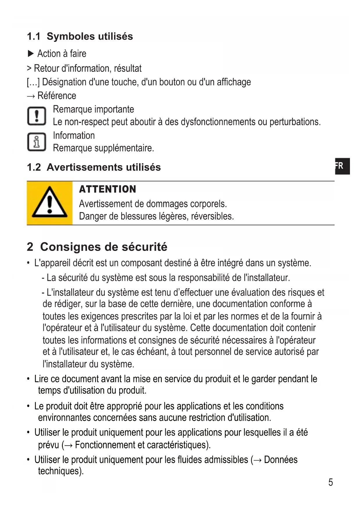 - L'appareil décrit est un composant destiné à être intégré dans un système - La sécurité du système est sous la responsabilité de l'installateur - L'installateur du système est tenu d’effectuer une évaluation des risques et de rédiger, sur la base de cette dernière, une documentation conforme à toutes les exigences prescrites par la loi et par les normes et de la fournir à l'opérateur et à l'utilisateur du système Cette documentation doit contenir toutes les informations et consignes de sécurité nécessaires à l'opérateur et à l'utilisateur et, le cas échéant, à tout personnel de service autorisé par l'installateur du système