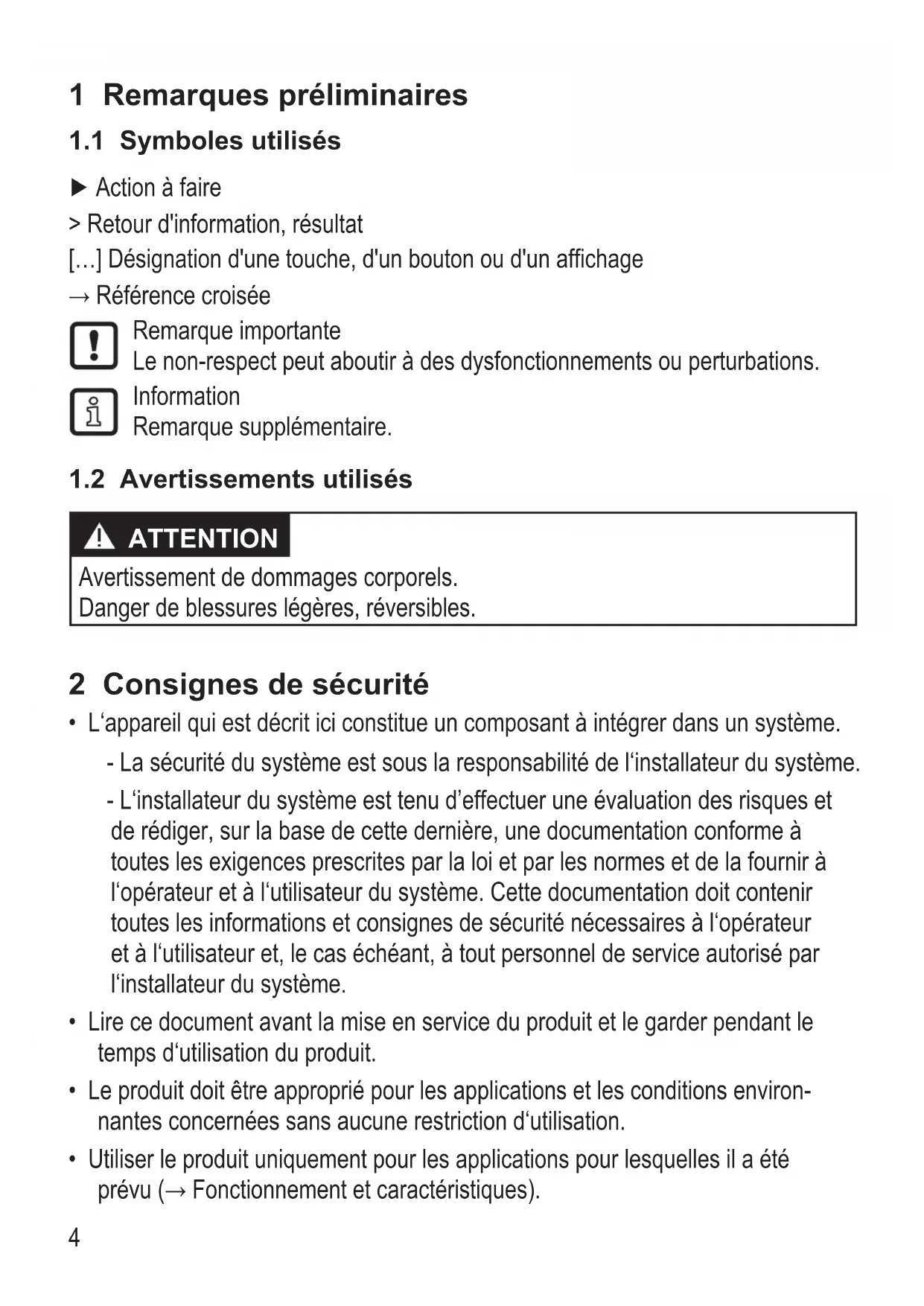- L‘appareil qui est décrit ici constitue un composant à intégrer dans un système - La sécurité du système est sous la responsabilité de l‘installateur du système - L‘installateur du système est tenu d’effectuer une évaluation des risques et de rédiger, sur la base de cette dernière, une documentation conforme à toutes les exigences prescrites par la loi et par les normes et de la fournir à l‘opérateur et à l‘utilisateur du système Cette documentation doit contenir toutes les informations et consignes de sécurité nécessaires à l‘opérateur et à l‘utilisateur et, le cas échéant, à tout personnel de service autorisé par l‘installateur du système
