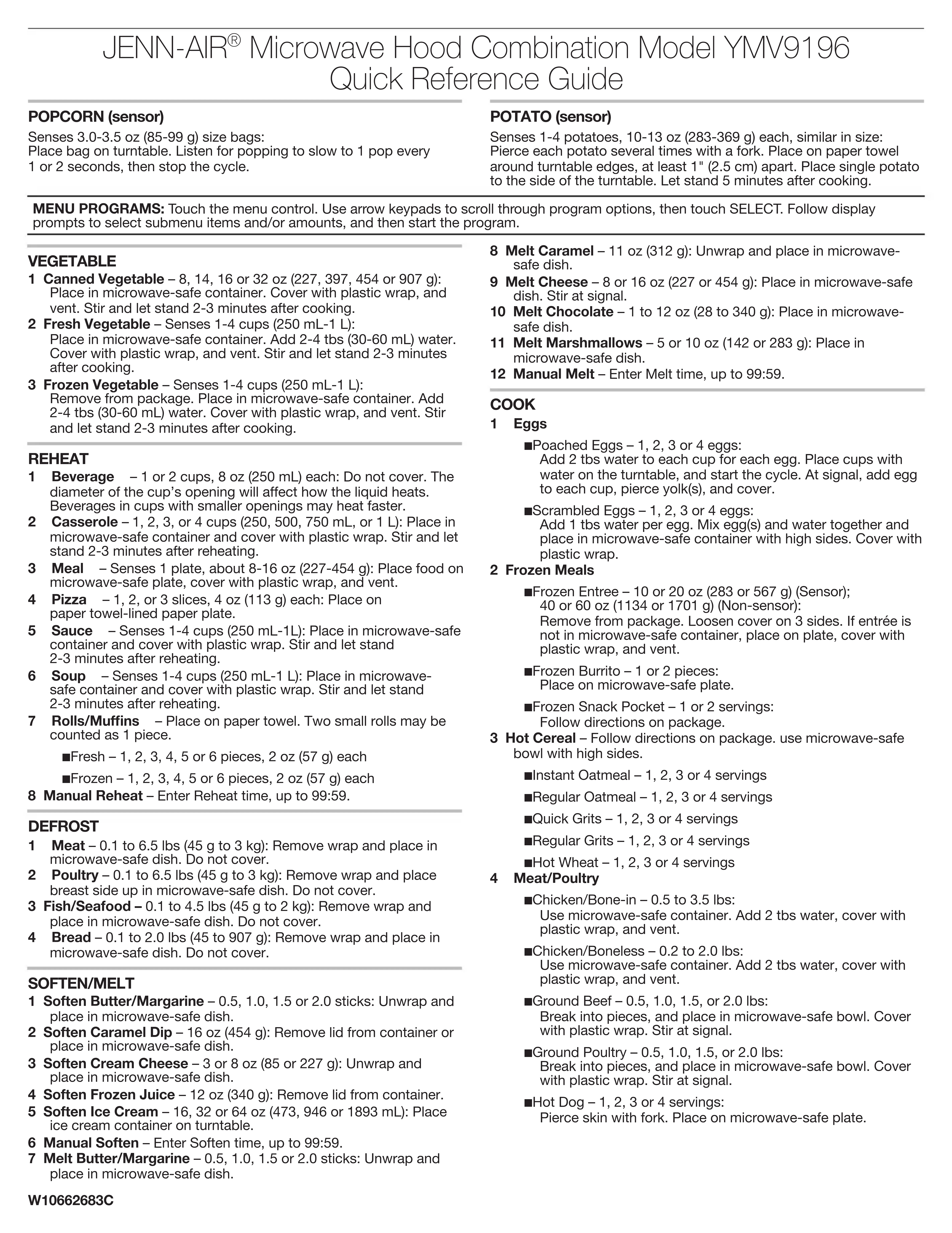 YJMV9196 POPCORN (maïs éclaté) (avec détection) Détecte des sacs d’une contenance de 3,0 à 3,5 oz (85 à 99 g) : Placer le sachet sur le plateau rotatif. Attendre que l’éclatement ralentisse à 1 éclatement toutes les 1 ou 2 secondes, puis mettre fin au programme. POTATO (patate) (avec détection) Détecte 1 à 4 patates, de 10 à 13 oz (283 à 369 g) chacune, de taille similaire : Percer plusieurs fois chaque patate avec une fourchette. Les disposer sur une feuille d’essuie-tout, sur un côté du plateau rotatif, à au moins 1" (2,5 cm) les unes des autres. S’il n’y a qu’une patate, la placer sur le pourtour du plateau rotatif. Laisser reposer 5 minutes après la cuisson. PROGRAMMES DE MENU : Appuyer sur la commande du menu. Utiliser les flèches pour faire défiler les options de programme, et appuyer sur la touche SELECT. Suivre les instructions à l’écran pour sélectionner un article de la liste de menus secondaires et/ou une quantité donnée puis démarrer le programme. VEGETABLE (légumes) 1 1 Légumes en conserve – 8, 14, 16 ou 32 oz (227, 397, 454 ou 907 g) : Placer dans un récipient allant au micro-ondes. Recouvrir d’une pellicule de plastique et laisser une ouverture d’échappement de l’air. Remuer et laisser reposer 2- à 3 minutes après la cuisson. 2 Légumes frais – Détecte 1 à 4 tasses (250 mL à 1 L) : Placer dans un récipient allant au micro-ondes. Ajouter 2 à 4 cuillerées à soupe (30-60 mL) d’eau. Recouvrir d’une pellicule de plastique et laisser une ouverture d’échappement de l’air. Remuer et laisser reposer 2 à 3 minutes après la cuisson. 3 Légumes surgelés – Détecte 1 à 4 tasses (250 mL à 1 L) : Sortir les légumes de l’emballage. Placer dans un récipient allant au microondes. Ajouter 2 à 4 cuillerées à soupe (30 à 60 mL) d’eau. Recouvrir d’une pellicule de plastique et laisser une ouverture d’échappement de l’air. Remuer et laisser reposer 2 à 3 minutes après la cuisson. REHEAT (réchauffage) 1 Boisson – 1 ou 2 tasses, 8 oz (250 mL) chacune : Ne pas couvrir. Le diamètre de l’ouverture de la tasse fait varier le temps de chauffage du liquide. Les boissons dans des tasses avec ouverture plus petite peuvent chauffer plus rapidement. 2 Mets en sauce – 1, 2, 3 ou 4 tasses (250, 500, 750 mL ou 1 L) : Placer dans un récipient allant au micro-ondes et recouvrir d’une pellicule de plastique. Remuer et laisser reposer 2 à 3 minutes après le réchauffage. 3 Repas – Détecte 1 assiette, environ 8 à 16 oz (227 à 454 g) : Placer l’aliment sur une assiette allant au micro-ondes, recouvrir d’une pellicule de plastique et laisser une ouverture d’échappement de l’air. 4 Pizza – 1, 2 ou 3 tranches, de 4 oz (113 g) chacune : Placer sur de l’essuie-tout dans une assiette en carton. 5 Sauce – Détecte 1 à 4 tasses (250 mL à 1 L) : Placer dans un récipient allant au micro-ondes et recouvrir d’une pellicule de plastique. Remuer et laisser reposer 2 à 3 minutes après le réchauffage. 6 Soupe – Détecte 1 à 4 tasses (250 mL à 1 L) : Placer dans un récipient allant au micro-ondes et recouvrir d’une pellicule de plastique. Remuer et laisser reposer 2 à 3 minutes après le réchauffage. 7 Rouleaux/muffins – Placer sur un essuie-tout. On peut considérer deux petits rouleaux comme une seule portion. ■ Frais – 1, 2, 3, 4, 5 ou 6 morceaux, 2 oz (57 g) chacun ■ Surgelés – 1, 2, 3, 4, 5 ou 6 morceaux, 2 oz (57 g) chacun 8 Réchauffage manuel – Entrer la durée de réchauffage, jusqu’à 99:59. DEFROST (décongélation) 1 Viande – 0,1 à 6,5 lb (45 g à 3 kg) : Retirer l’emballage et placer dans un plat allant au micro-ondes. Ne pas couvrir. 2 Volaille – 0,1 à 6,5 lb (45 g à 3 kg) : Retirer l’emballage et placer la volaille, poitrine vers le haut, dans un plat allant au four à microondes. Ne pas couvrir. 3 Poisson/fruits de mer – 0,1 à 4,5 lb (45 g à 2 kg) : Retirer l’emballage et placer dans un plat allant au micro-ondes. Ne pas couvrir. 4 Pain – 0,1 à 2 lb (45 à 907 g) : Retirer l’emballage et placer dans un plat allant au micro-ondes. Ne pas couvrir. SOFTEN/MELT (ramollir/faire fondre) 1 Ramollir beurre/margarine – 0,5, 1, 1,5 ou 2 bâtonnets : Déballer et placer dans un plat allant au four à micro-ondes. 2 Ramollir trempette au caramel – 16 oz (454 g) : Retirer le couvercle du récipient ou placer dans un plat allant au micro- ondes. 3 Ramollir fromage à la crème – 3 ou 8 oz (85 ou 227 g) : Déballer et placer dans un plat allant au micro-ondes. 4 Ramollir jus surgelé – 12 oz (340 g) : Retirer le couvercle du contenant. 5 Ramollir crème glacée – 16, 32 ou 64 oz (473, 946 ou 1893 mL) : Placer le pot de crème glacée sur le plateau rotatif. 6 Ramolir manuellement – Entrer la durée, jusqu’à 99:59. 7 Faire fondre beurre/margarine – 0,5, 1, 1,5 ou 2 bâtonnets : Déballer et placer dans un plat allant au micro-ondes. 8 Faire fondre caramel – 11 oz (312 g) : Déballer et placer dans un plat allant au micro-ondes. 9 Faire fondre fromage – 8 ou 16 oz (227 ou 454 g) : Placer dans un plat allant au micro-ondes. Remuer au signal sonore. 10 Faire fondre chocolat – 1 à 12 oz (28 à 340 g) : Placer dans un plat allant au micro-ondes. 11 Faire fondre guimauves – 5 ou 10 oz (142 ou 283 g) : Placer dans un plat allant au micro-ondes. 12 Faire fondre manuellement – Entrer la durée, jusqu’à 99:59. COOK (cuisson) 1 OEufs ■ OEufs pochés - 1, 2, 3 ou 4 oeufs : Ajouter 2 cuillerées à soupe d’eau par oeuf dans chaque tasse. Placer les tasses remplies d’eau sur le plateau rotatif, et démarrer le programme. Au signal, ajouter un oeuf dans chaque tasse, percer le ou les jaune(s) et couvrir. ■ OEufs brouillés - 1, 2, 3 ou 4 oeufs : Ajouter 1 cuillerée à soupe d’eau par oeuf. Mélanger le ou les oeuf(s) et placer dans un récipient à bords élevés allant au micro-ondes. Recouvrir d’une pellicule de plastiq