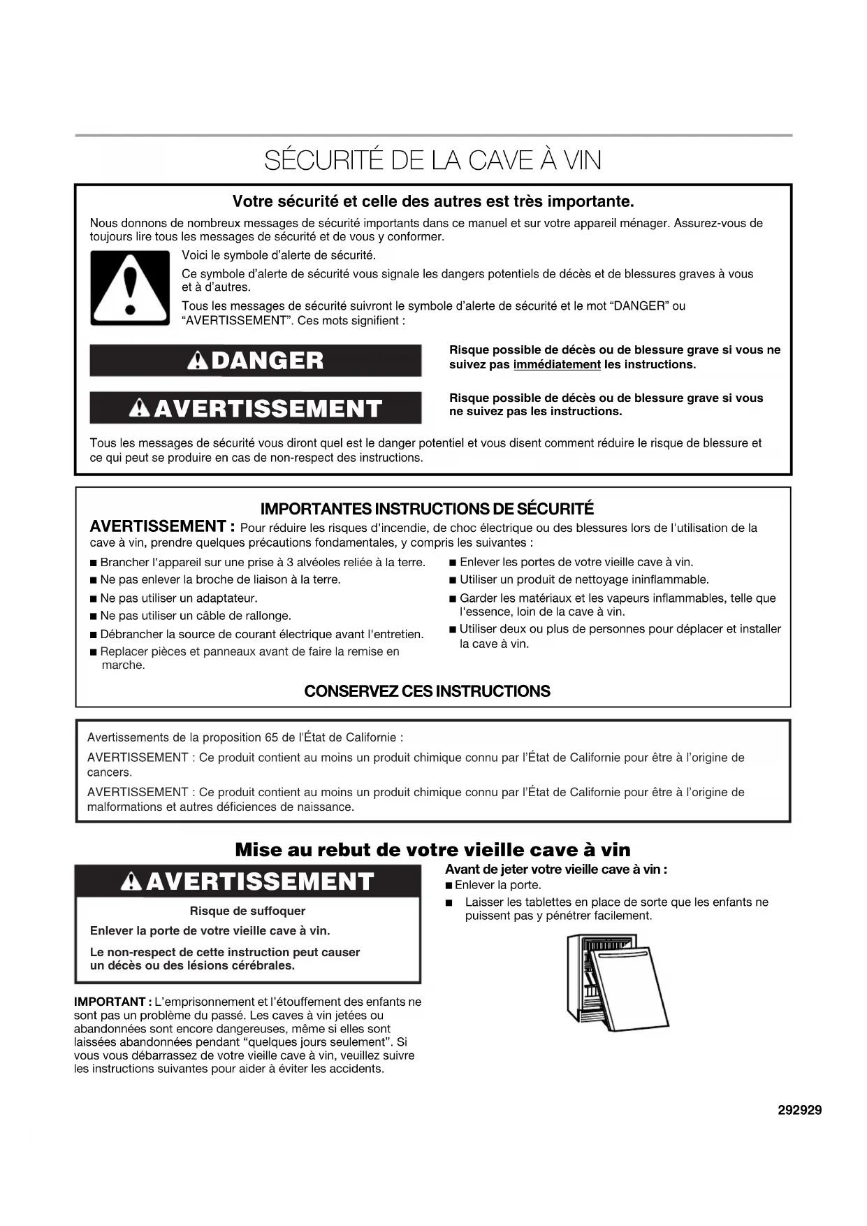 malformations et autres déficiences de naissance. AVERTISSEMENT Risque de suffoquerEnlever la porte de votre vieille cave à vin. Le non-respect de cette instruction peut causer un décès ou des lésions cérébrales.303030