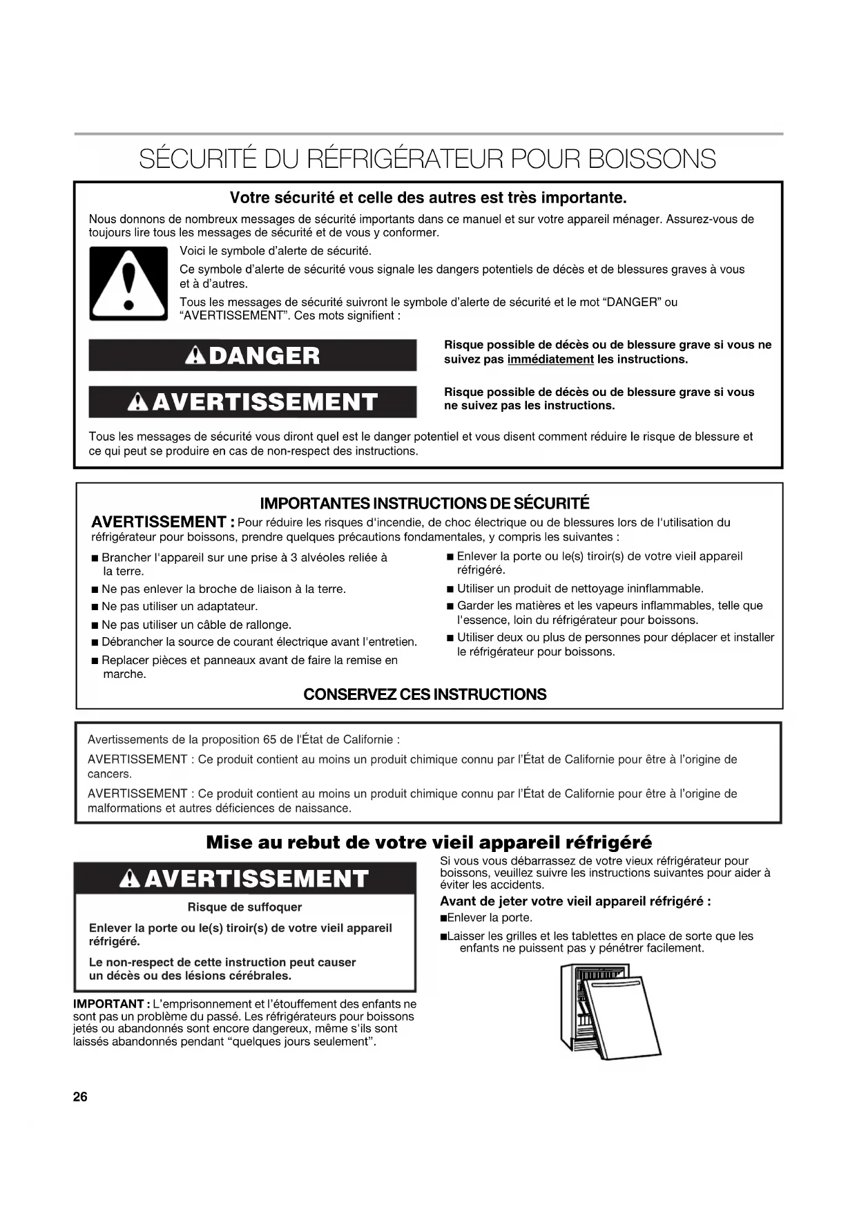 malformations et autres déficiences de naissance. AVERTISSEMENT Risque de suffoquerEnlever la porte ou le(s) tiroir(s) de votre vieil appareil réfrigéré.Le non-respect de cette instruction peut causer un décès ou des lésions cérébrales.27