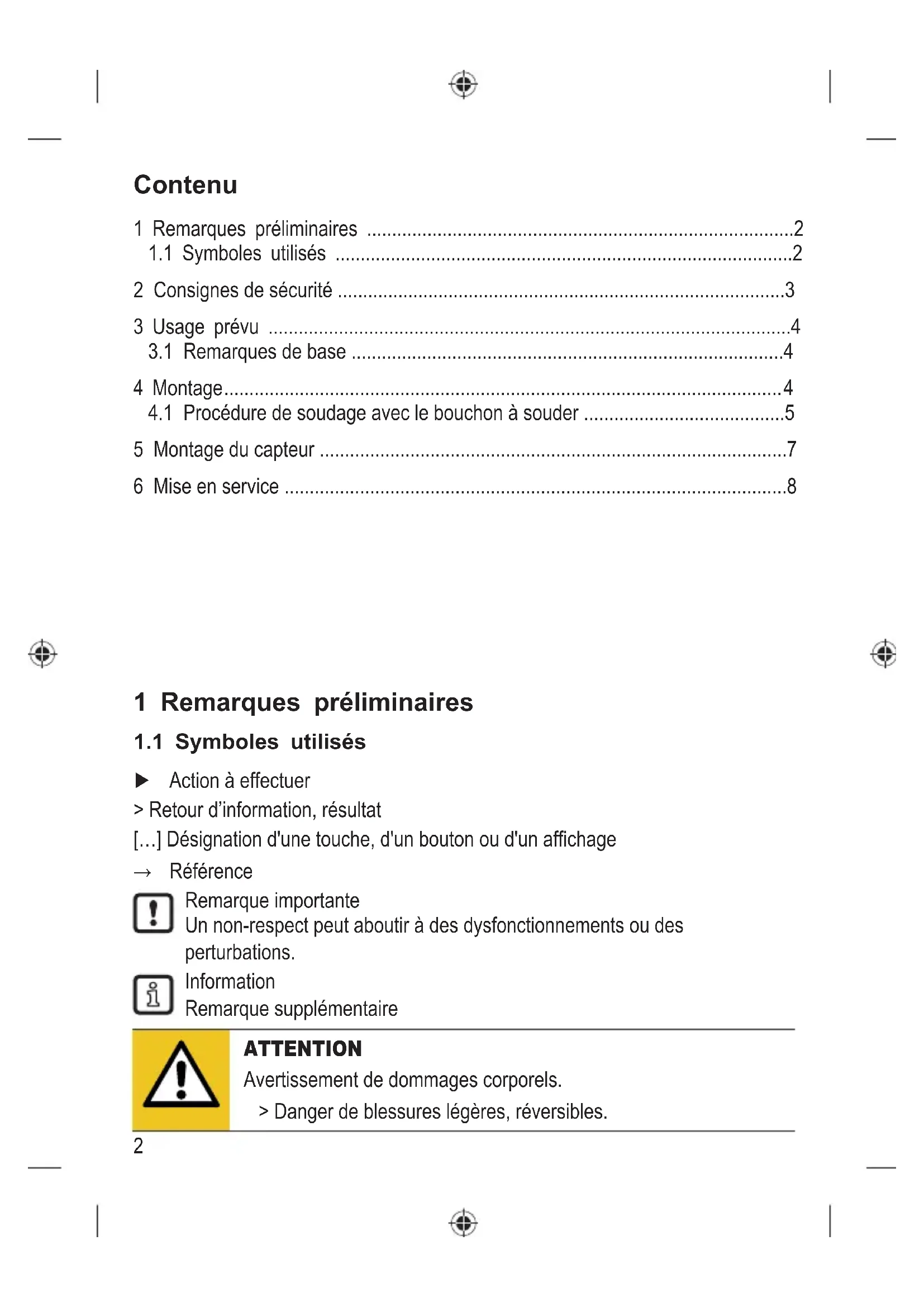 - Assurer une protection efficace du produit contre l’endommagement.4 3 Usage prévu Le raccord à souder permet le montage de capteurs dans des cuves ou des systèmes de tuyaux.
