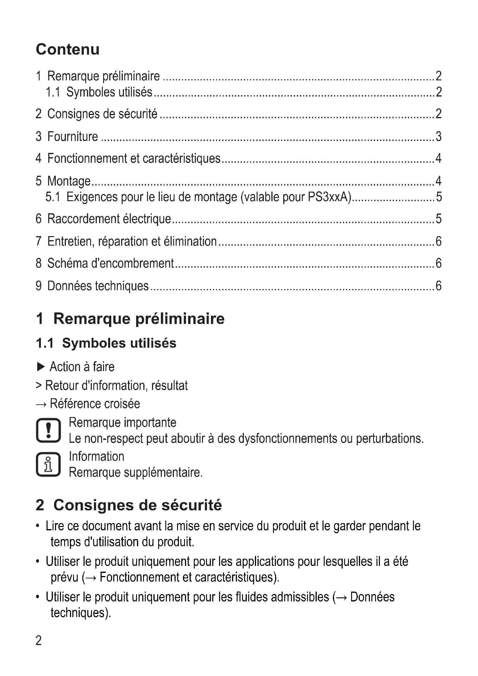 - Utiliser le produit uniquement pour les fluides admissibles (→ Données techniques). Contenu 1 Remarque préliminaire ........................................................................................2