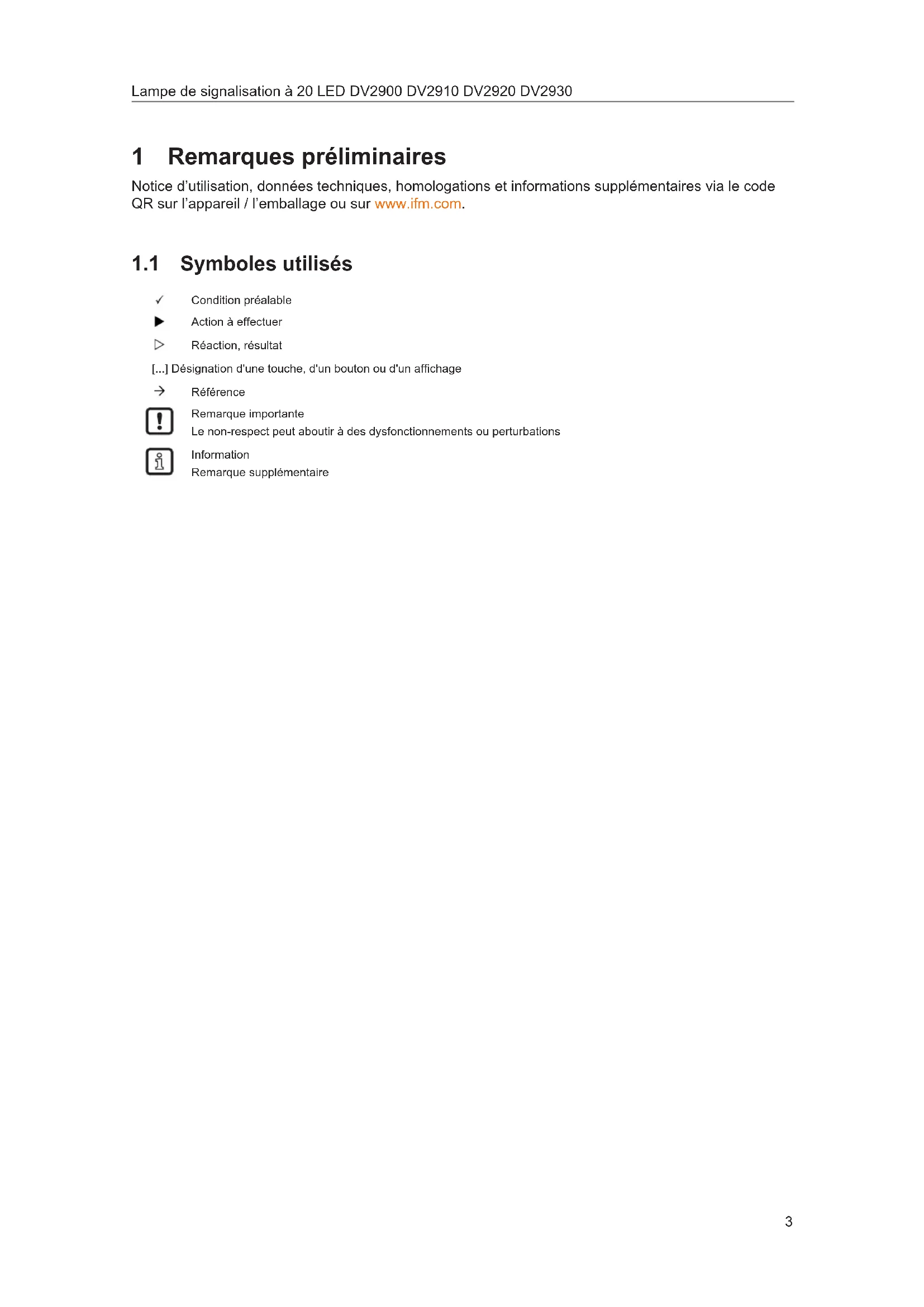 1 Remarques préliminaires Notice d’utilisation, données techniques, homologations et informations supplémentaires via le code QR sur l’appareil / l’emballage ou sur www.ifm.com. 1.1 Symboles utilisés Condition préalable Action à effectuer Réaction, résultat [...] Désignation d'une touche, d'un bouton ou d'un affichage Référence Remarque importante Le non-respect peut aboutir à des dysfonctionnements ou perturbations Information Remarque supplémentaireDV2900 DV2910 DV2920 DV2930 Lampe de signalisation à 20 LED