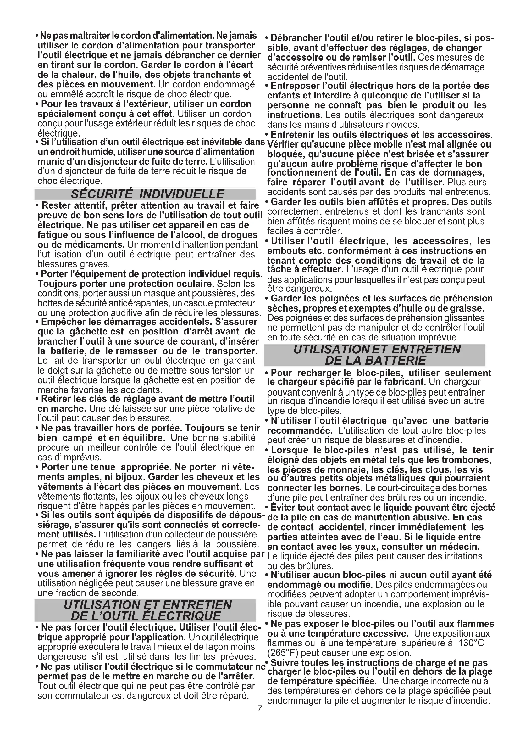 - Pour recharger le bloc-piles, utiliser seulement le chargeur spécié par le fabricant. Un chargeur pouvant convenir à un type de bloc-piles peut entraîner un risque d’incendie lorsqu’il est utilisé avec un autre type de bloc-piles.