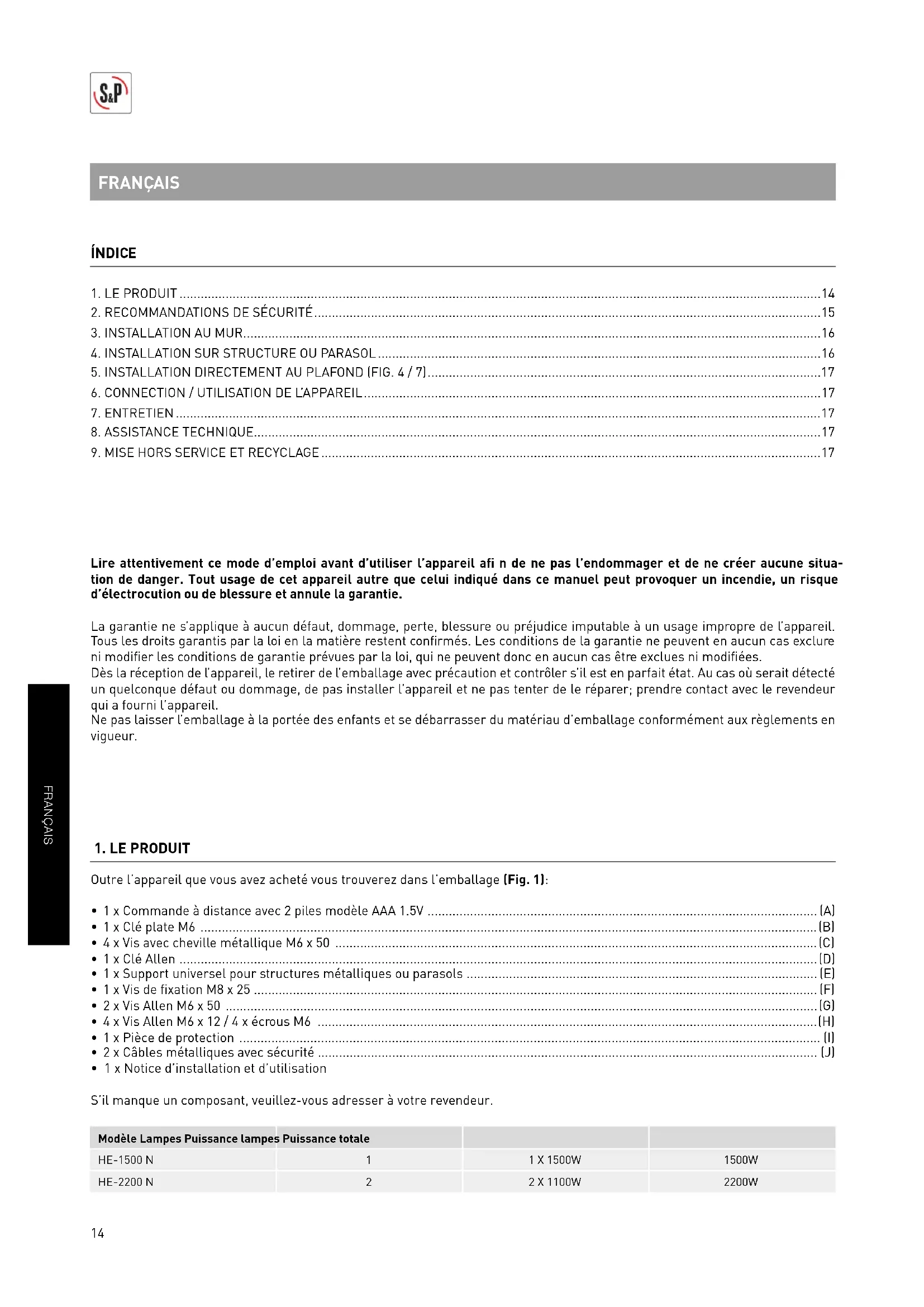 - 1 x Notice d’installation et d’utilisation S’il manque un composant, veuillez-vous adresser à votre revendeur. Modèle Lampes Puissance lampes Puissance totale HE-1500 N 1 1 X 1500W 1500W HE-2200 N 2 2 X 1100W 2200W FRANÇAIS15 FRANÇAIS