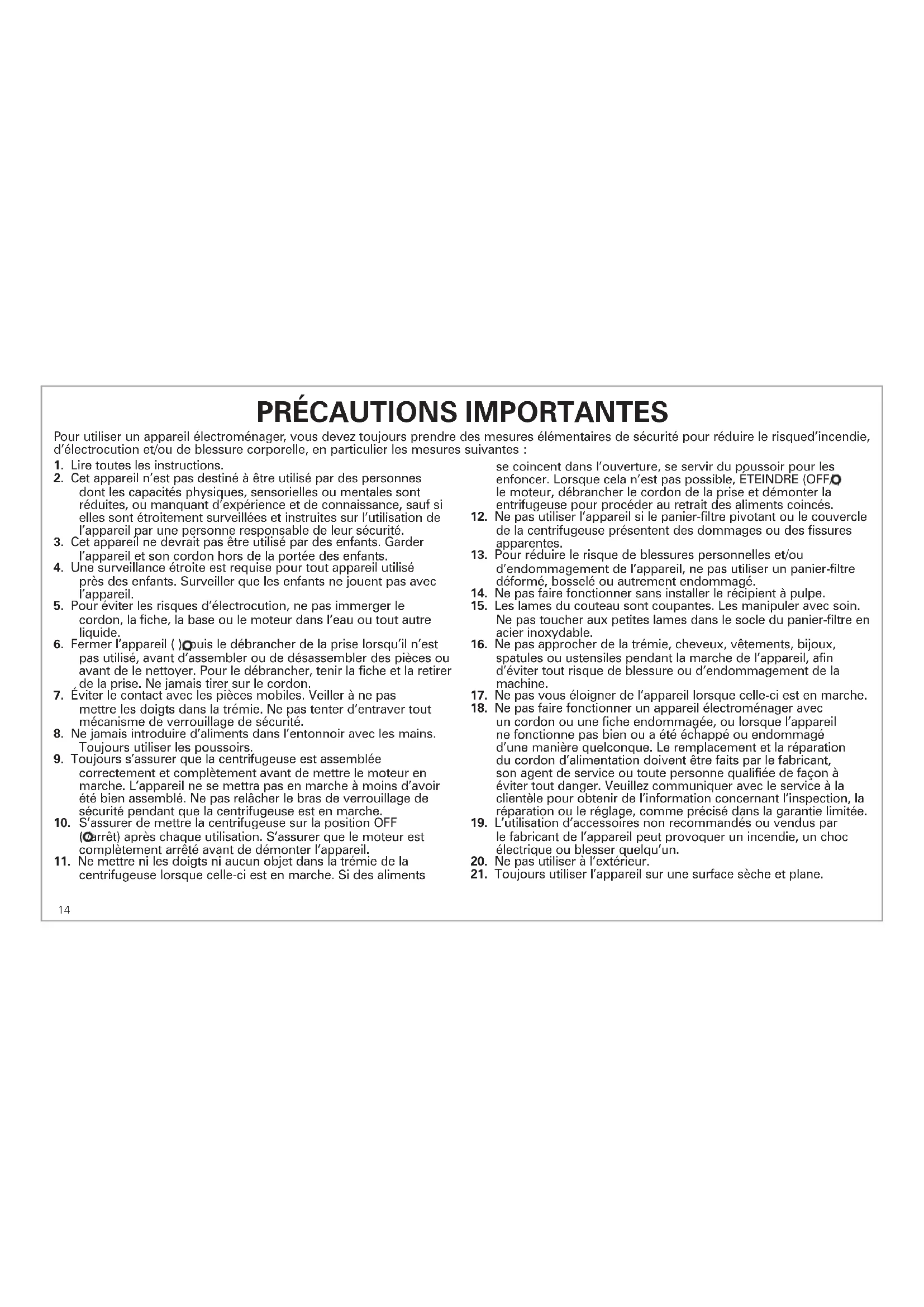 14. Ne pas faire fonctionner sans installer le récipient à pulpe.
