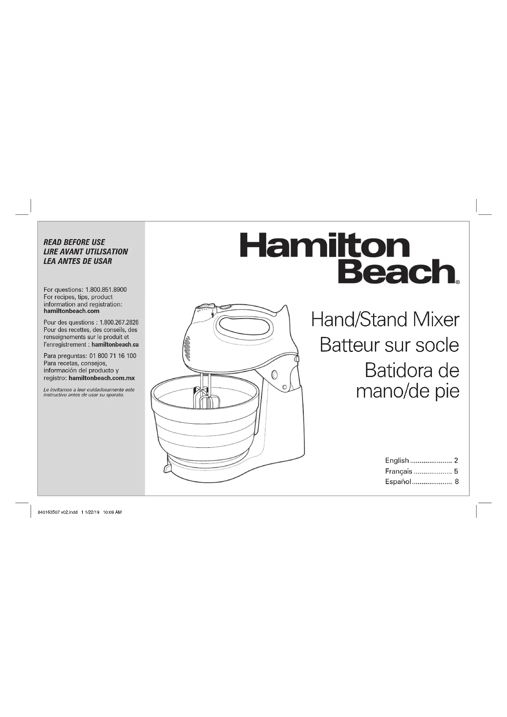 Autres consignes de sécurité pour le consommateur Cet appareil est destiné à un usage domestique uniquement. w AVERTISSEMENT Risque de choc électrique : Cet appareil est fourni avec une fiche polarisée (une broche large) pour réduire le risque d’électrocution. Cette fiche n’entre que dans un seul sens dans une prise polarisée. Ne contrecarrez pas l’objectif sécuritaire de cette fiche en la modifiant de quelque manière que ce soit ou en utilisant un adaptateur. Si vous ne pouvez pas insérer complètement la fiche dans la prise, inversez la fiche. Si elle refuse toujours de s’insérer, faire remplacer la prise par un électricien. La longueur du cordon installé sur cet appareil a été sélectionnée afin de réduire les risques d’enchevêtrement ou de faux pas causés par un fil trop long. L’utilisation d’une rallonge approuvée est permise si le cordon est trop court. Les caractéristiques électriques de la rallonge doivent être équivalentes ou supérieures aux caractéristiques de l’appareil. Prendre toutes les précautions nécessaires pour installer la rallonge de manière à ne pas la faire courir sur le comptoir ou sur une table pour éviter qu’un enfant ne tire sur le cordon ou trébuche accidentellement. 840163507 v02.indd 5 1/22/19 10:10 AM6 Pièces et caractéristiques Comment utiliser votre batteur à main/sur socle Pour commander des pièces : Canada : 1.800.267.2826 www.hamiltonbeach.ca Avant la première utilisation : Laver accessoires dans de l’eau chaude savonneuse; rincer et essuyer.