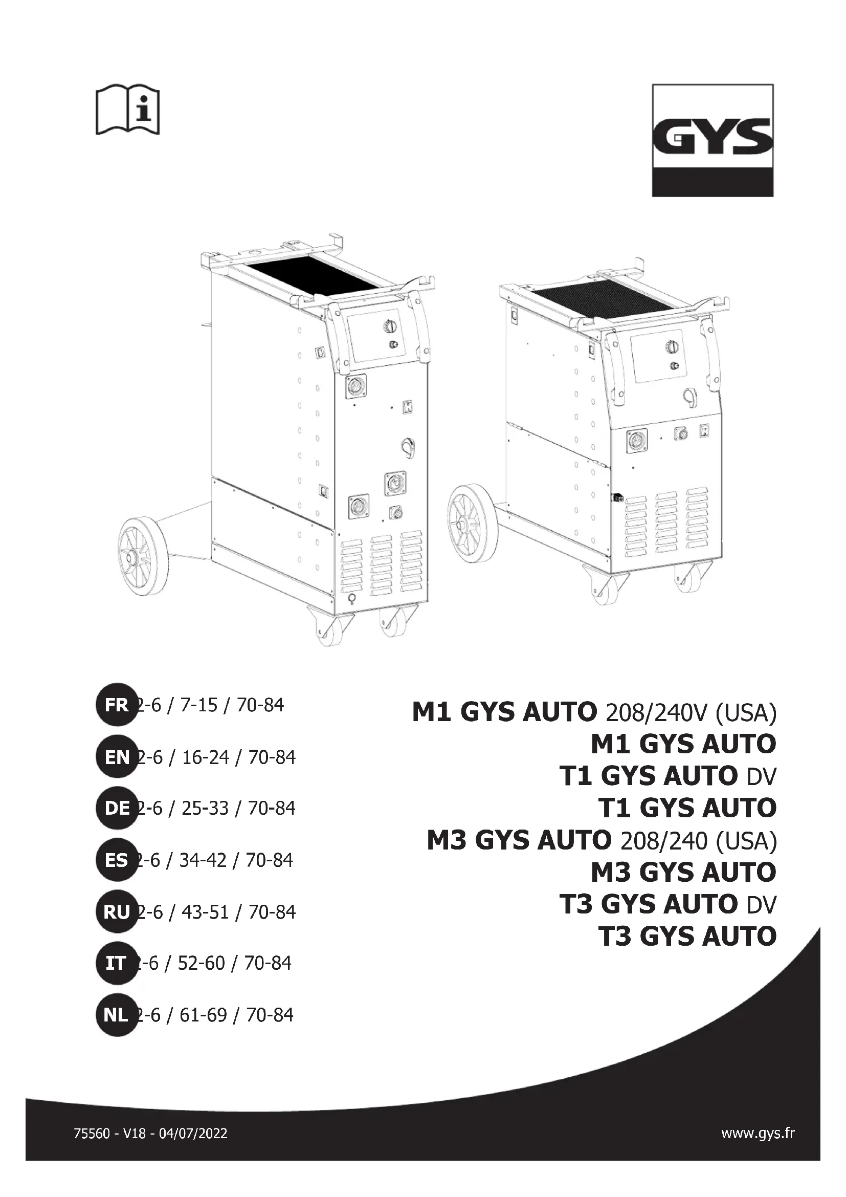 Notice originale DESCRIPTION Merci de votre choix ! An de tirer le maximum de satisfaction de votre poste, veuillez lire avec attention ce qui suit : Les M1 GYS AUTO, T1 GYS AUTO, M3 GYS AUTO et T3 GYS AUTO sont des postes de soudure semi-automatique « synergic » sur roues, ventilés pour le soudage (MIG ou MAG). Ils sont recommandés pour le soudage des aciers, des inox, des aluminiums et pour le soudo brasage des aciers haute résistance avec les ls CuSi et CuAl (idéal en réparation carrosserie). Leur réglage est simple et rapide grâce à la fonction « vitesse de l synergique ». Les T1 GYS AUTO et T3 GYS AUTO fonctionnent sur une alimentation 400V triphasée ou en 230V/400 V triphasée pour le T1 GYS AUTO DV et T3 GYS AUTO DV. Le M1 GYS AUTO et M3 GYS AUTO fonctionnent en 230V monophasées ou en 208/240V pour le M1 GYS AUTO 208/240V et M3 GYS AUTO 208/240V. ALIMENTATION ÉLECTRIQUE Le courant eectif absorbé (I1e) pour les conditions d’utilisation maximales est indiqué sur l’appareil. Vérier que l’alimentation et ses protections (fusible et/ou disjoncteur) sont compatibles avec le courant nécessaire en utilisation. L’appareil doit être placé de façon telle que la che de prise de courant soit accessible. - Les T1 GYS AUTO et T3 GYS AUTO sont livrés avec une prise 16 A de type 3P + N + E conforme à la IEC 60309-2. - Les M1 GYS AUTO et M3 GYS AUTO (sauf USA et cas particulier) sont livrés avec une prise monophasée 16 A de type JT 003-B avec connecteur de terre. - Les M1 GYS AUTO et M3 GYS AUTO doivent être reliés à une prise 230V 1PH AVEC terre protégée par un disjoncteur 16A retardé et diérentiel 30mA. - Les T1 GYS AUTO, T3 GYS AUTO, T1 GYS AUTO DV et T3 GYS AUTO DV doivent être relié à une prise 400V 3ph AVEC terre protégée par un disjoncteur 16A retardé et diérentiel 30mA. Ne pas utiliser de rallonge ayant une section infé- rieure à 2,5 mm². - Pour les T1 GYS AUTO DV et T3 GYS AUTO DV seulement : Alimentation 230V triphasée, ATTENTION : cet appareil est pré-monté en usine en 400V triphasé. Si votre installation électrique est en 230V triphasé, veuillez modier le branche- ment de la plaque de bornes à l’intérieur du poste. Cette manipulation doit être eectuée par une personne compétente. Pour ce faire se référer au schéma de branchement 230V situé à l’intérieur du poste. L’alimentation électrique doit être protégée par un disjoncteur 16A et un diérentiel 30mA. (Voir schéma électrique en n de manuel) - Pour les M1 GYS AUTO 208/240V et M3 GYS AUTO 208/240V : Alimentation 208V monophasée, ATTENTION : cet appareil est pré-monté en usine en 240V monophasé. Si votre installation électrique est en 208V monophasée, veuillez modier le branchement de la plaque de bornes à l’intérieur du poste. Cette manipulation doit être eectuée par une personne compétente. Pour ce faire se référer au schéma de branchement 208V situé à l’intérieur du poste. L’alimen- tation électrique doit être protégée par un disjoncteur 16A et un diérentiel 30mA. (Voir schéma électrique en n de manuel). DESCRIPTION DU POSTE (FIG I & II)