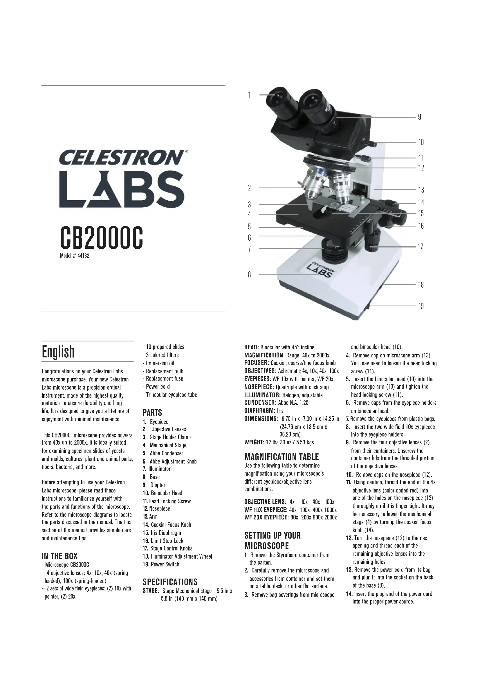 TWO YEAR LIMITED WARRANTY. for more detailed information, please visit www.CelestronLabs.com Torrance, CA 90503 TEL (800) 421-9649 www.CelestronLabs.com Copyright 2014 Celestron | All rights reserved. (Products or instructions may change without notice or obligation.) Designed and intended for those 14 years of age and older. Français Félicitations pour l’acquisition de votre microscope Celestron Labs. Votre microscope est un instrument optique de précision, fabriqué avec des matériaux de la plus grande qualité afin d’assurer sa durabilité et sa longue durée d’utilisation. Il est conçu pour vous offrir une vie entière de découvertes avec un niveau d’entretien minimal. Le microscope CB2000CF offre des puissances d’agrandissement de 40x à 2000x. Il convient parfaitement à l’observation d’échantillons de levures et de moisissures, de cultures, d’éléments végétaux et animaux, de fibres, de bactéries et autres. Avant de commencer à utiliser votre microscope Celestron Labs, lisez ces instructions pour vous familiariser avec les composants et les fonctions du microscope. Référez-vous au schémas du microscope pour repérer les pièces mentionnées dans le présent manuel. La dernière sectiondu mode d’emploi donne des conseils d’entretien et de maintenance faciles à appliquer.