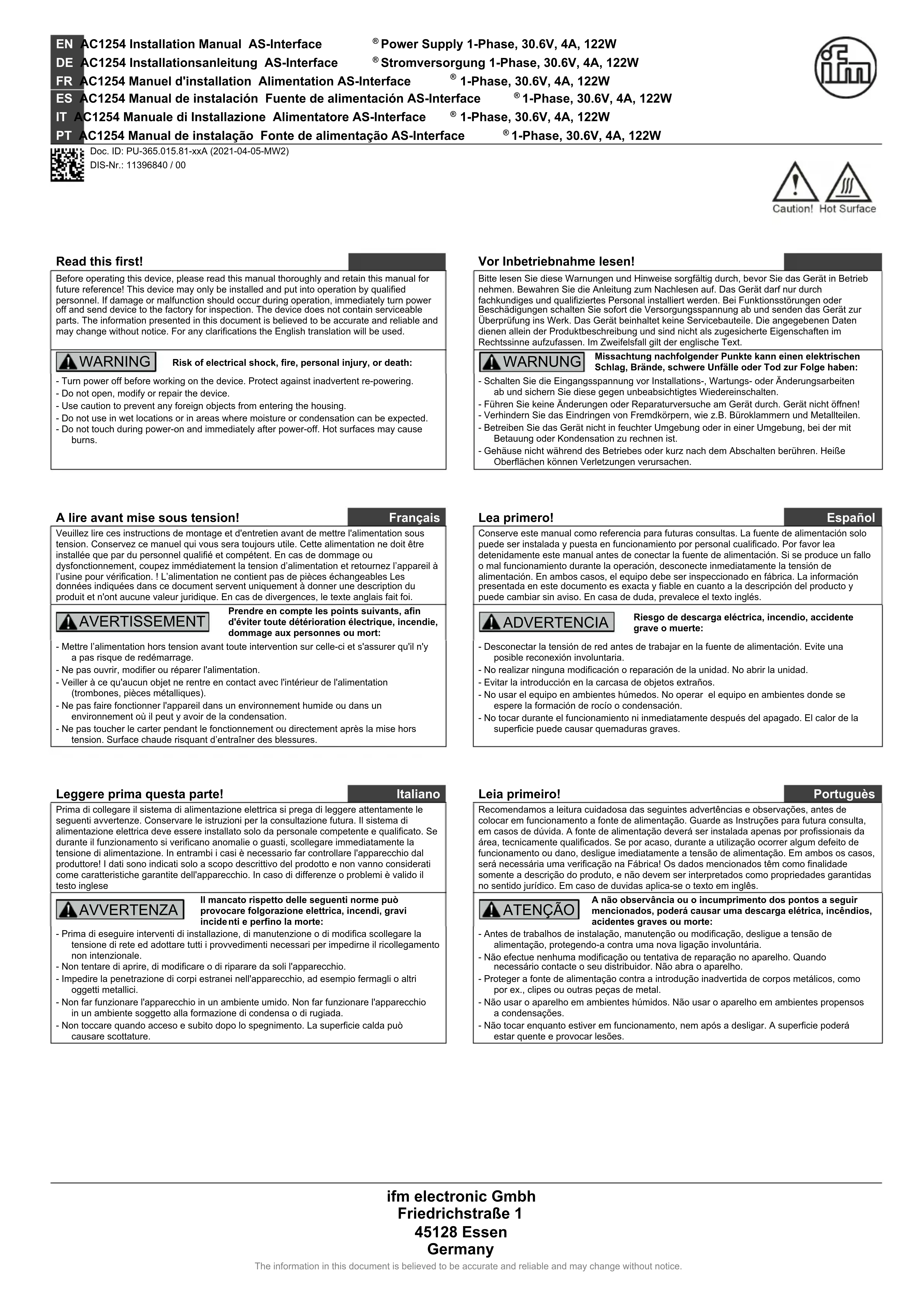 Téléchargez la notice de votre Manuel d'installation électrique au format PDF gratuitement ! Retrouvez votre notice AC1254 - IFM et reprennez votre appareil électronique en main. Sur cette page sont publiés tous les documents nécessaires à l'utilisation de votre appareil AC1254 de la marque IFM.
