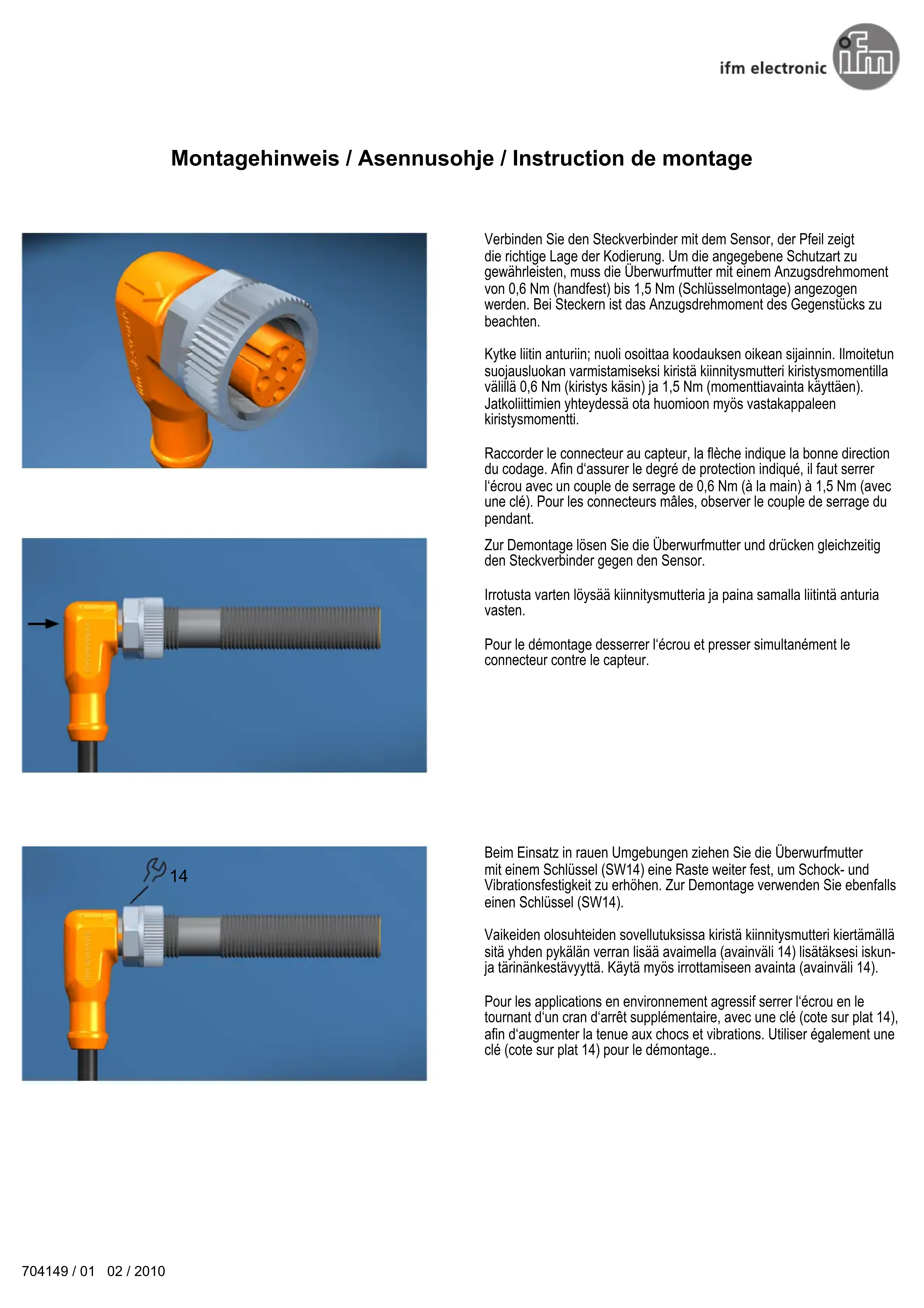 Pour les applications en environnement agressif serrer 1'écrou en le tournant d'un cran d'arrêt supplémentaire, avec une clé (cote sur plat 14), afin d'augmenter la tenue aux chocs et vibrations. Utiliser également une clé (cote sur plat 14) pour le demontage..