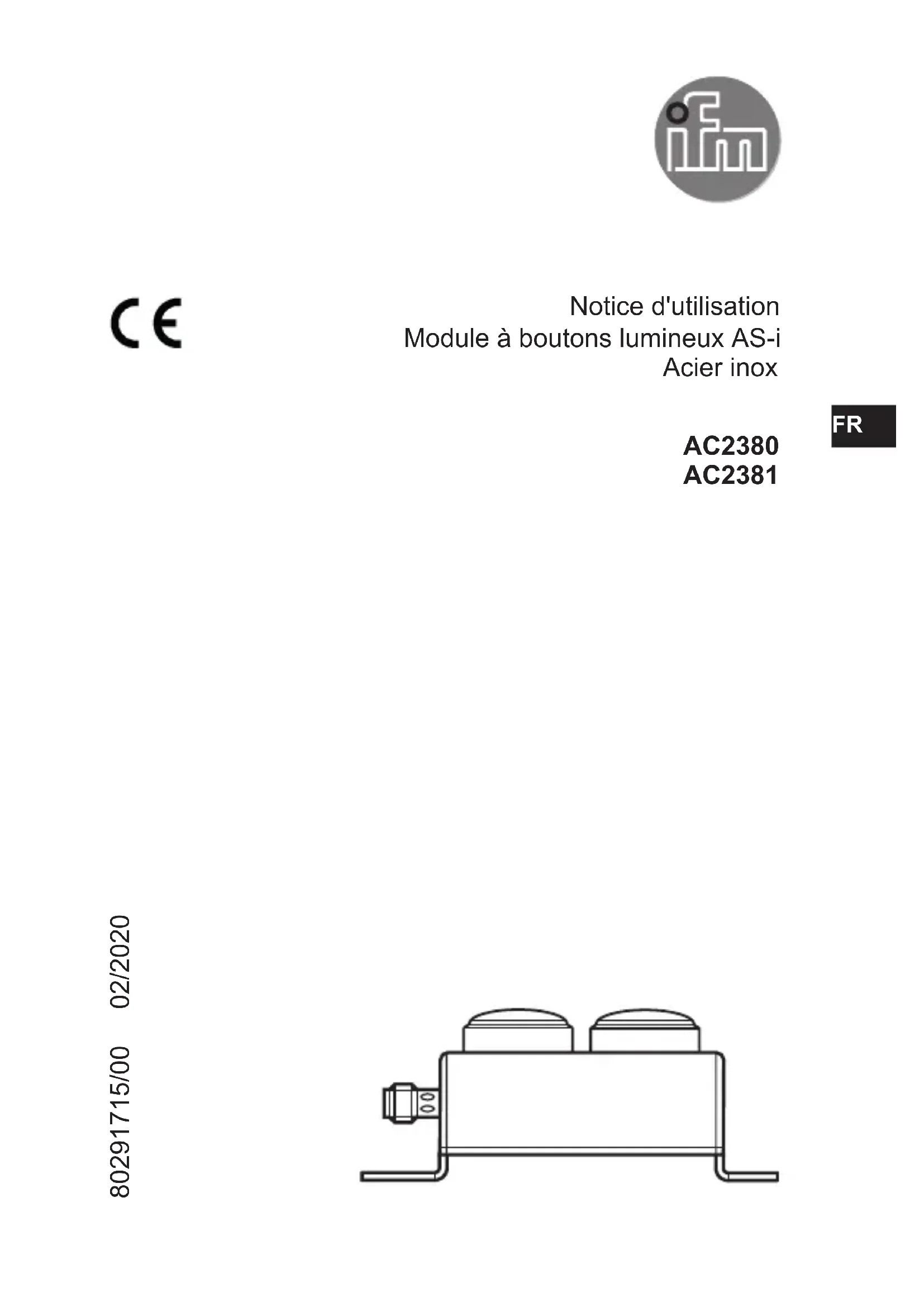 Notice d'utilisation Module à boutons lumineux AS-i Acier inox AC2380 AC2381 80291715/00 02/2020 FR2 Contenu 1 Remarques préliminaires 3 11 Explication des symboles 3 2 Consignes de sécurité 3 3 Fonctionnement et caractéristiques 3 4 Montage 4 5 Raccordement électrique 4 51 Raccordement des broches/bits de données 4 52 Bits de données 4 6 Adressage 5 7 Fonctionnement 5 8 Schéma d'encombrement 5 9 Maintenance, réparation et élimination 53