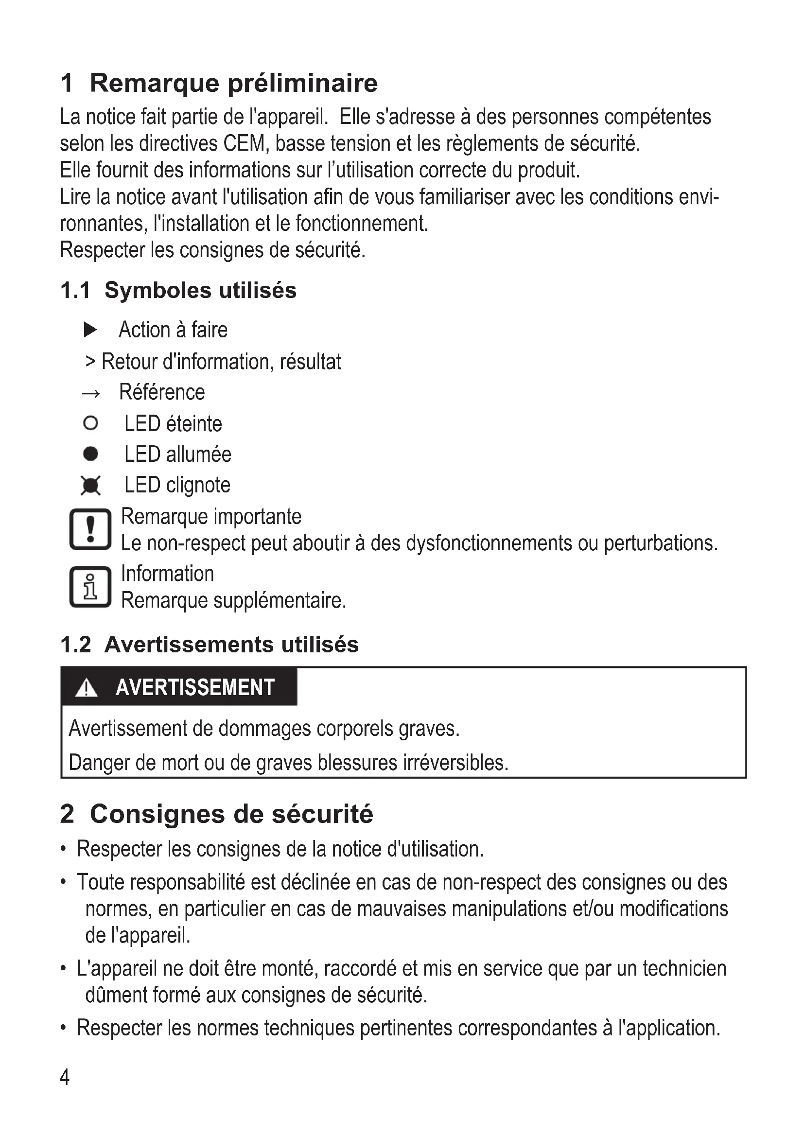 AVERTISSEMENT Avertissement de dommages corporels graves Danger de mort ou de graves blessures irréversibles 2 Consignes de sécurité