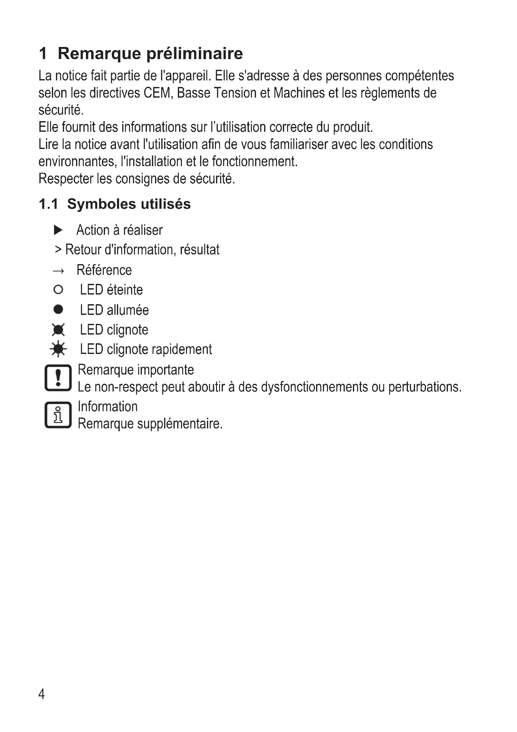 - Une utilisation incorrecte peut mener à un mauvais fonctionnement de l'appareil Par conséquent, des dommages matériels et/ou corporels pendant le fonctionnement de l'installation sont possibles Respecter donc toutes les remarques de cette notice concernant l'installation et l'utilisation de l'appareil Respecter également les consignes de sécurité pour le fonctionnement de l'installation complète