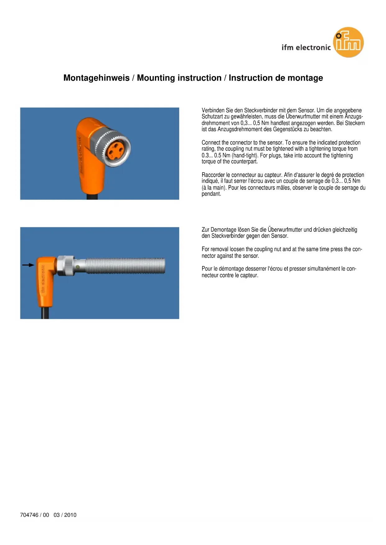 torque of the counterpart. Raccorder le connecteur au capteur. Afin d‘assurer le degré de protection indiqué, il faut serrer l‘écrou avec un couple de serrage de 0,3... 0,5 Nm (à la main). Pour les connecteurs mâles, observer le couple de serrage du pendant. Zur Demontage lösen Sie die Überwurfmutter und drücken gleichzeitig den Steckverbinder gegen den Sensor. For removal loosen the coupling nut and at the same time press the con- nector against the sensor. Pour le démontage desserrer l‘écrou et presser simultanément le con- necteur contre le capteur.