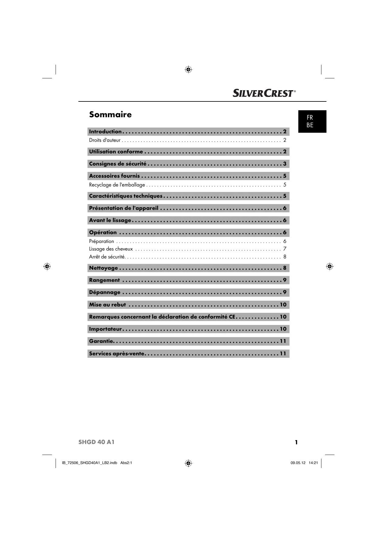 Introduction 2 Droits d'auteur 2 Utilisation conforme 2 Consignes de sécurité 3 Accessoires fournis 5 Recyclage de l'emballage 5 Caractéristiques techniques 5 Présentation de l'appareil 6 Avant le lissage 6 Opération 6 Préparation 6 Lissage des cheveux 7 Arrêt de sécurité 8 Nettoyage 8 Rangement 9 Dépannage 9 Mise au rebut 10 Remarques concernant la déclaration de conformité CE 10 Importateur 10 Garantie 11 Services après-vente 11
